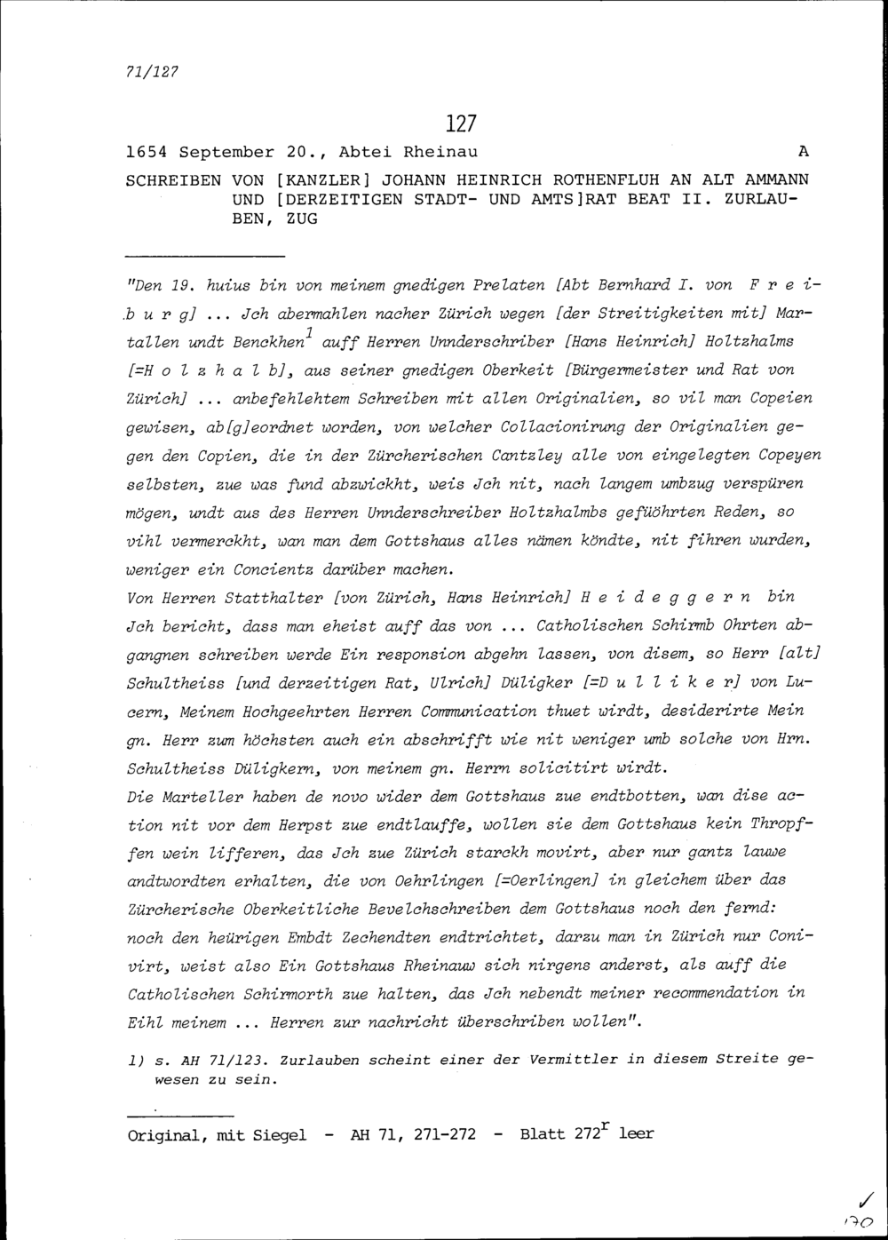 Schreiben von Johann Heinrich Rothenfluh, Kanzler, an Beat II. Zurlauben, Altammann...