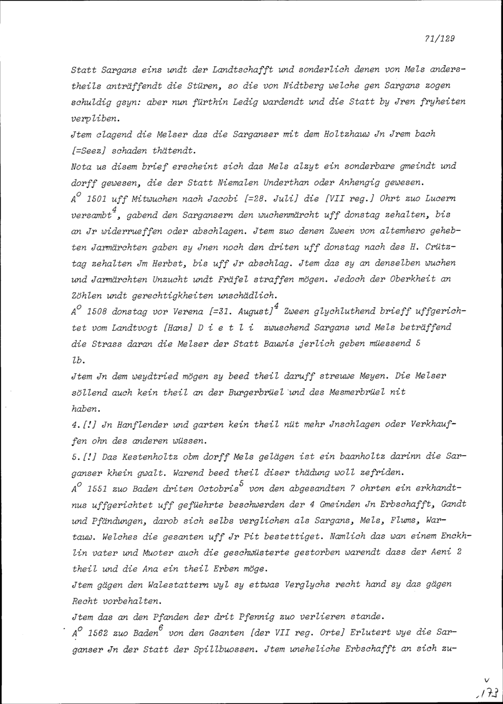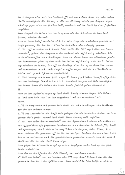 Notiz von Beat II. Zurlauben, Stadt- und Amtrat Zug, in Zusammenhang mit dem Streit zwischen der Stadt Sargans und Mels