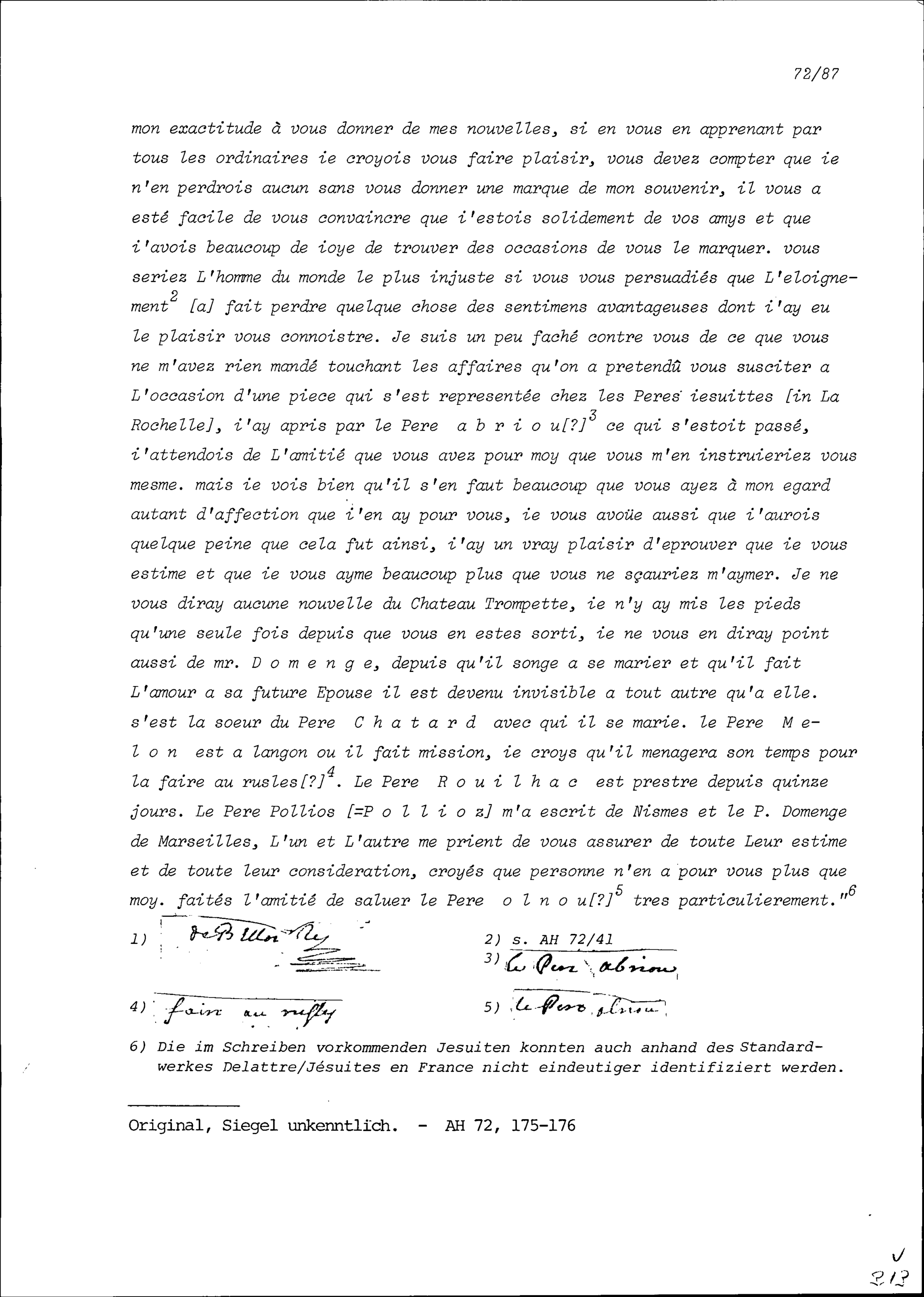 Schreiben von NN Bellot, Jesuitenpater, an Ägid Franz Andermatt, La Rochelle