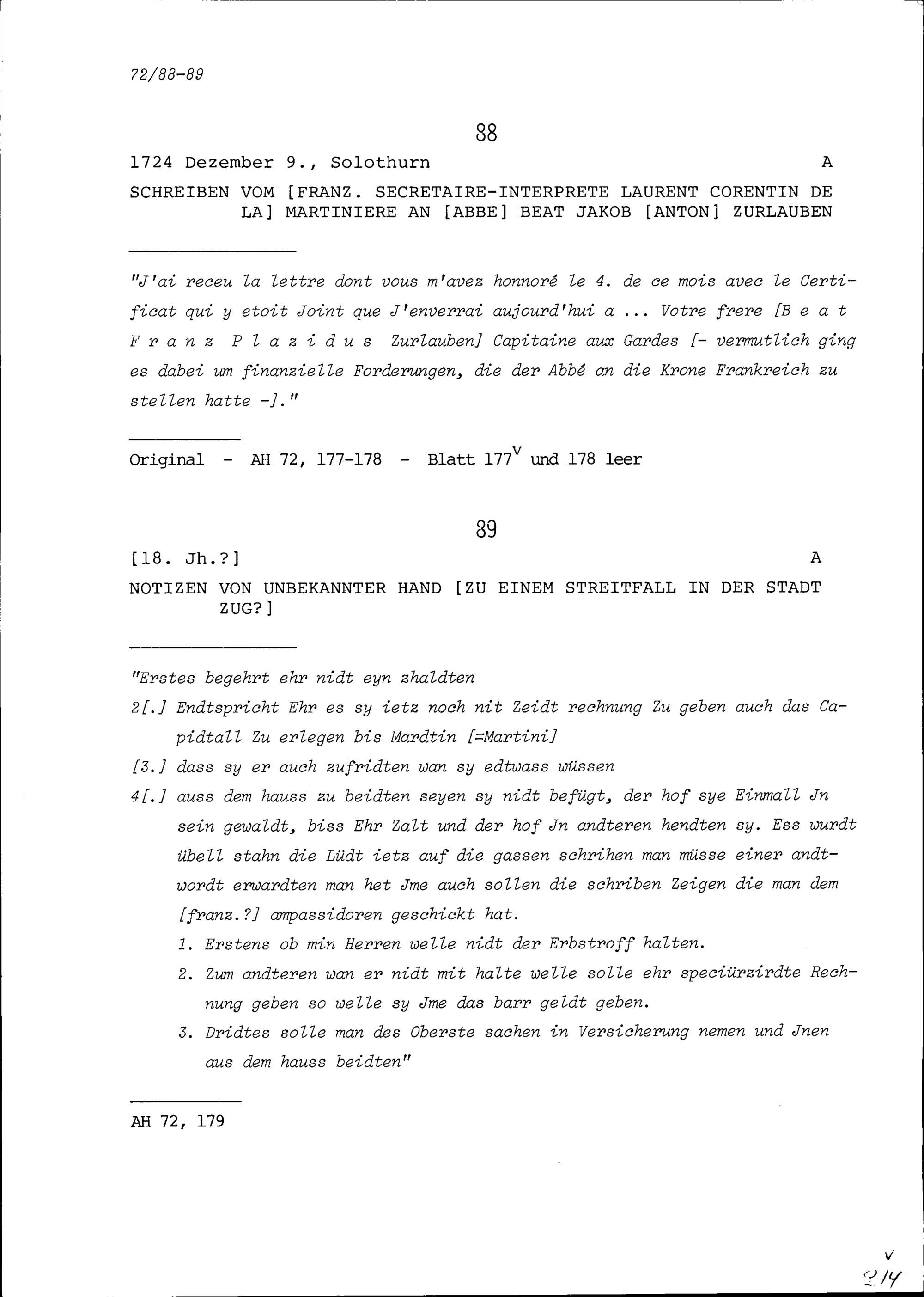 Schreiben von Laurent Corentin de la Martinière, Dolmetscher von Frankreich, an Beat Jakob Anton Zurlauben, Priester