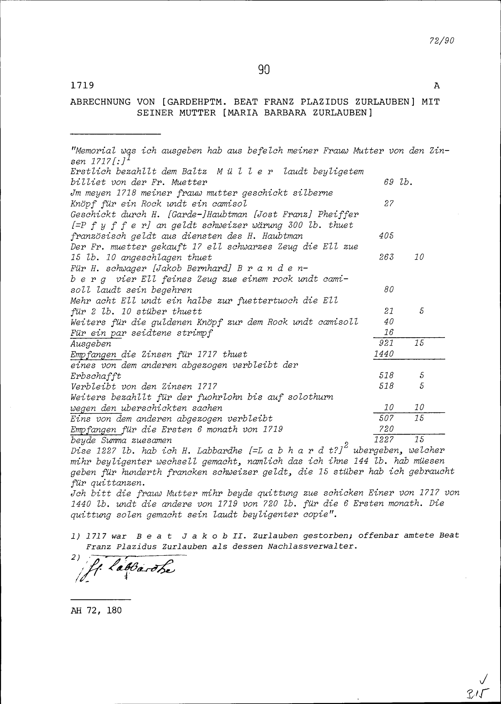 Abrechnung von Beat Franz Plazidus Zurlauben, Gardehauptmann, mit seiner Mutter Maria Barbara Zurlauben