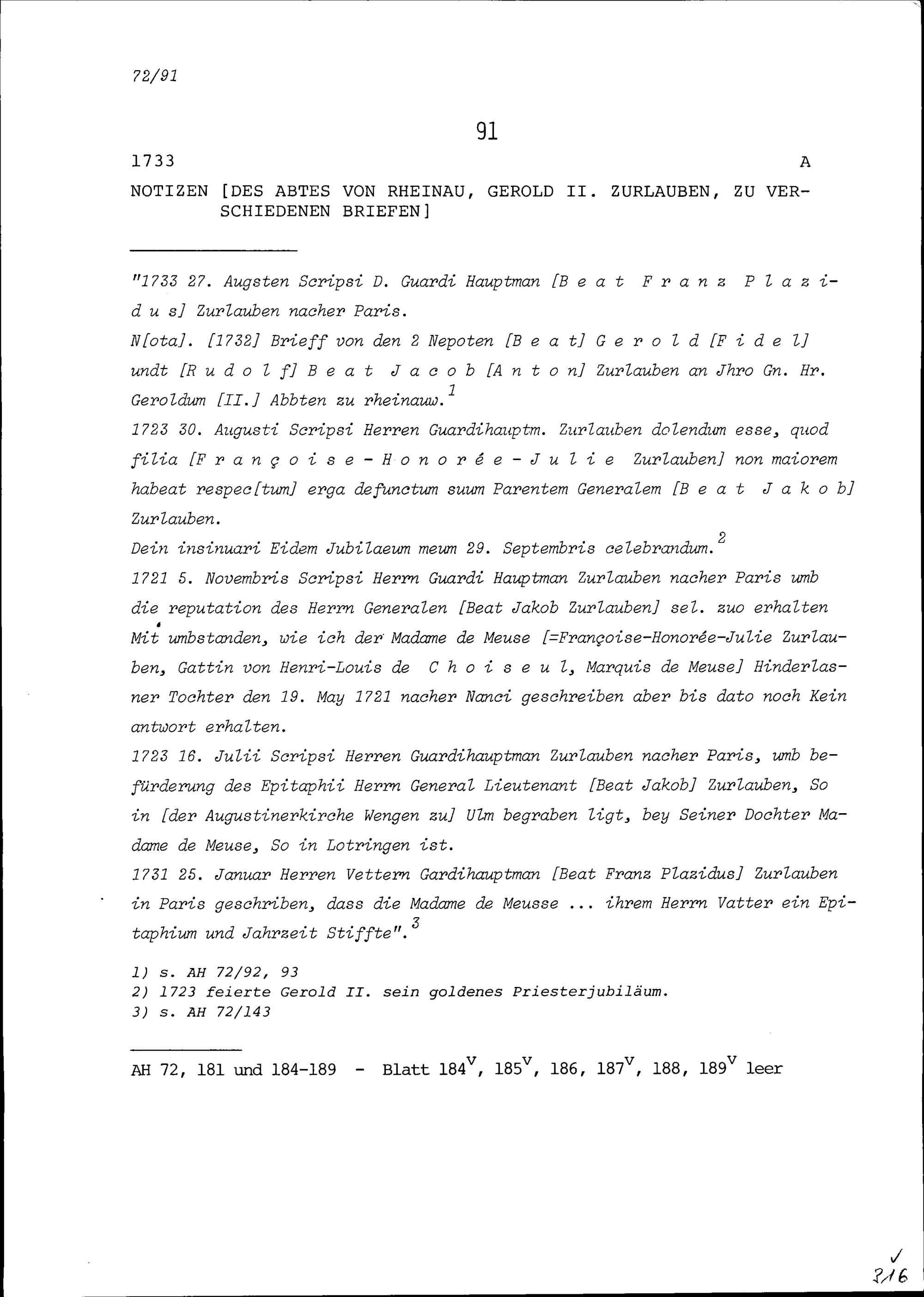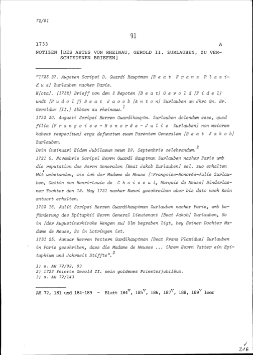 Notiz von Gerold II. Zurlauben, Abt von Rheinau, zu verschiedenen Briefen