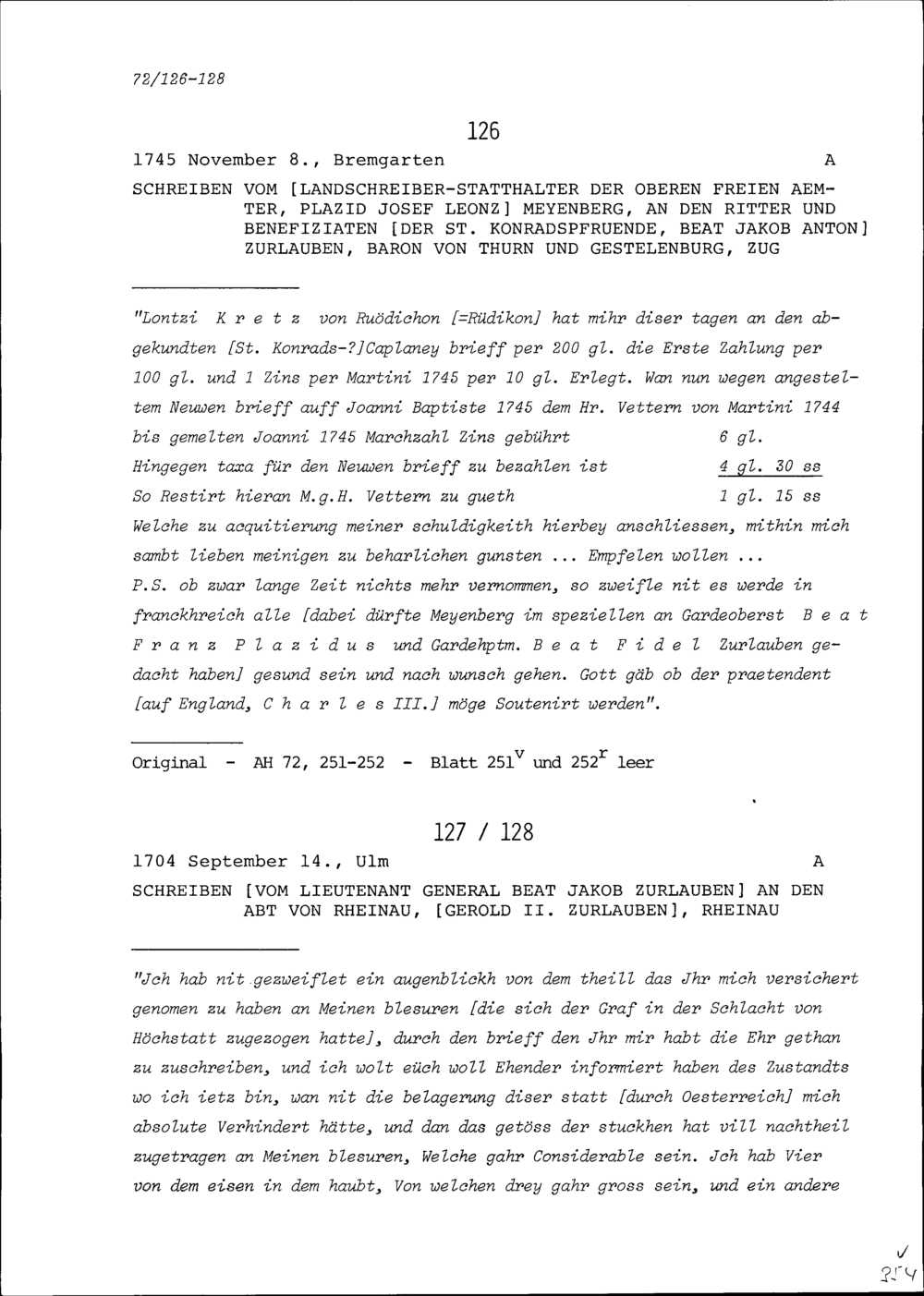 Schreiben von Plazid Josef Leonz Meyenberg, Landschreiberstatthalter der Oberen Freien Ämter, an Beat Jakob Anton Zurlauben, Priester und Benefiziat der Sankt Konradspfrund, Zug