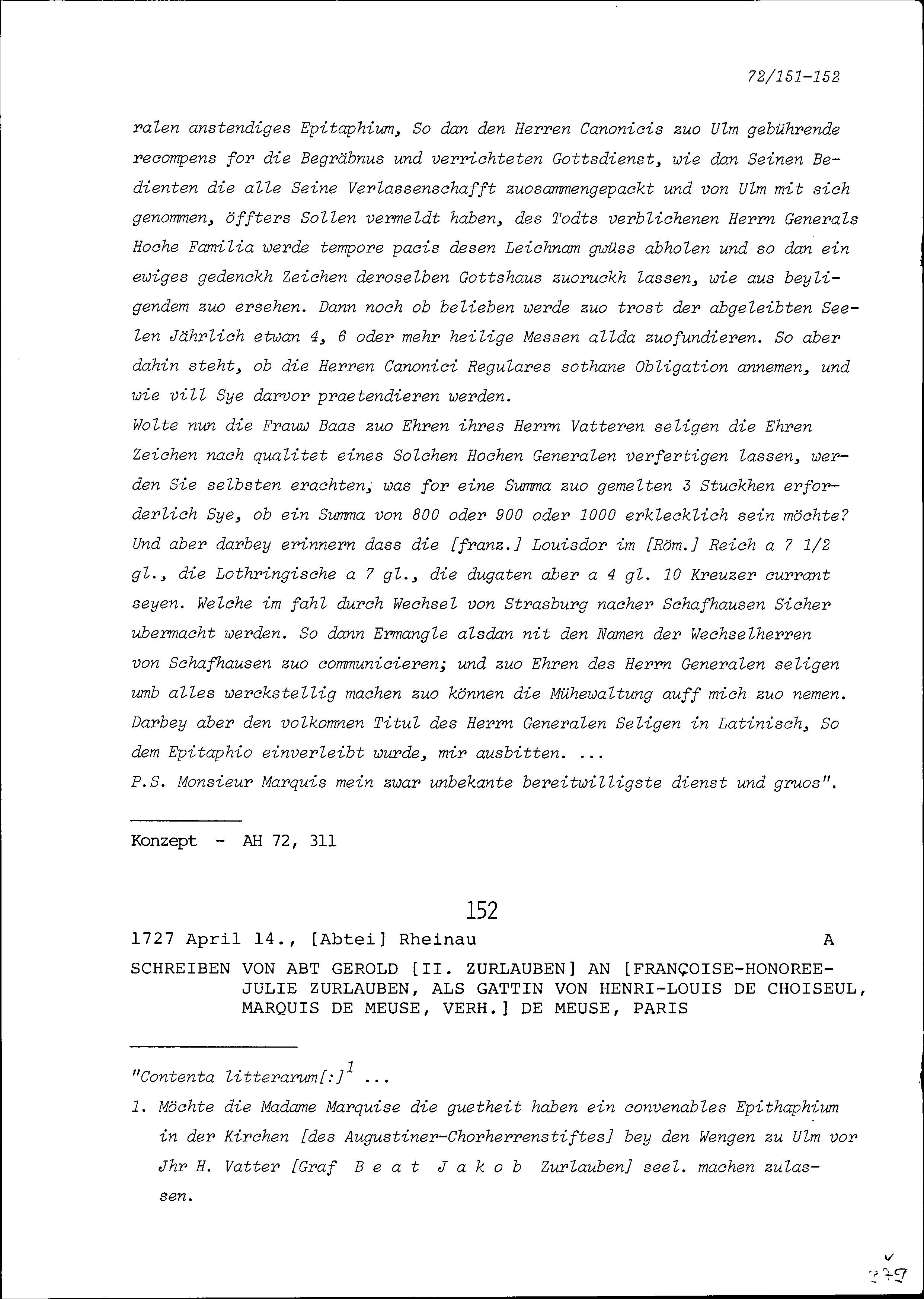 Schreiben von Gerold II. Zurlauben, Abt von Rheinau, an Françoise-Honorée-Julie Zurlauben, Gattin von Henri-Louis de Choiseul, Marquis de Meuse, Paris