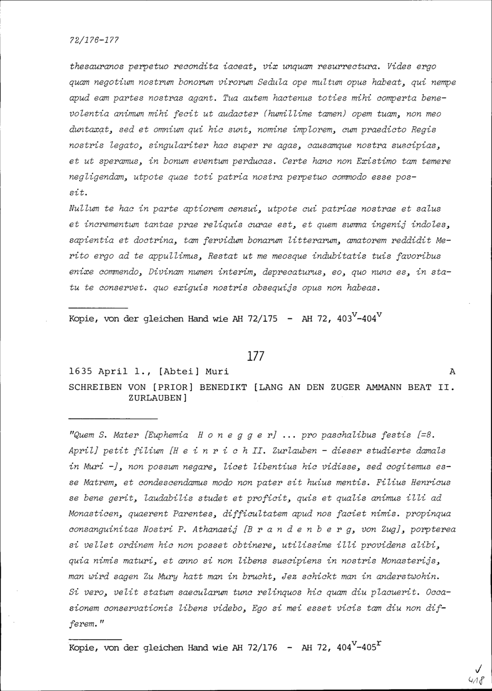 Schreiben von Benedikt Lang, Prior von Muri, an Beat II. Zurlauben, Ammann Zug