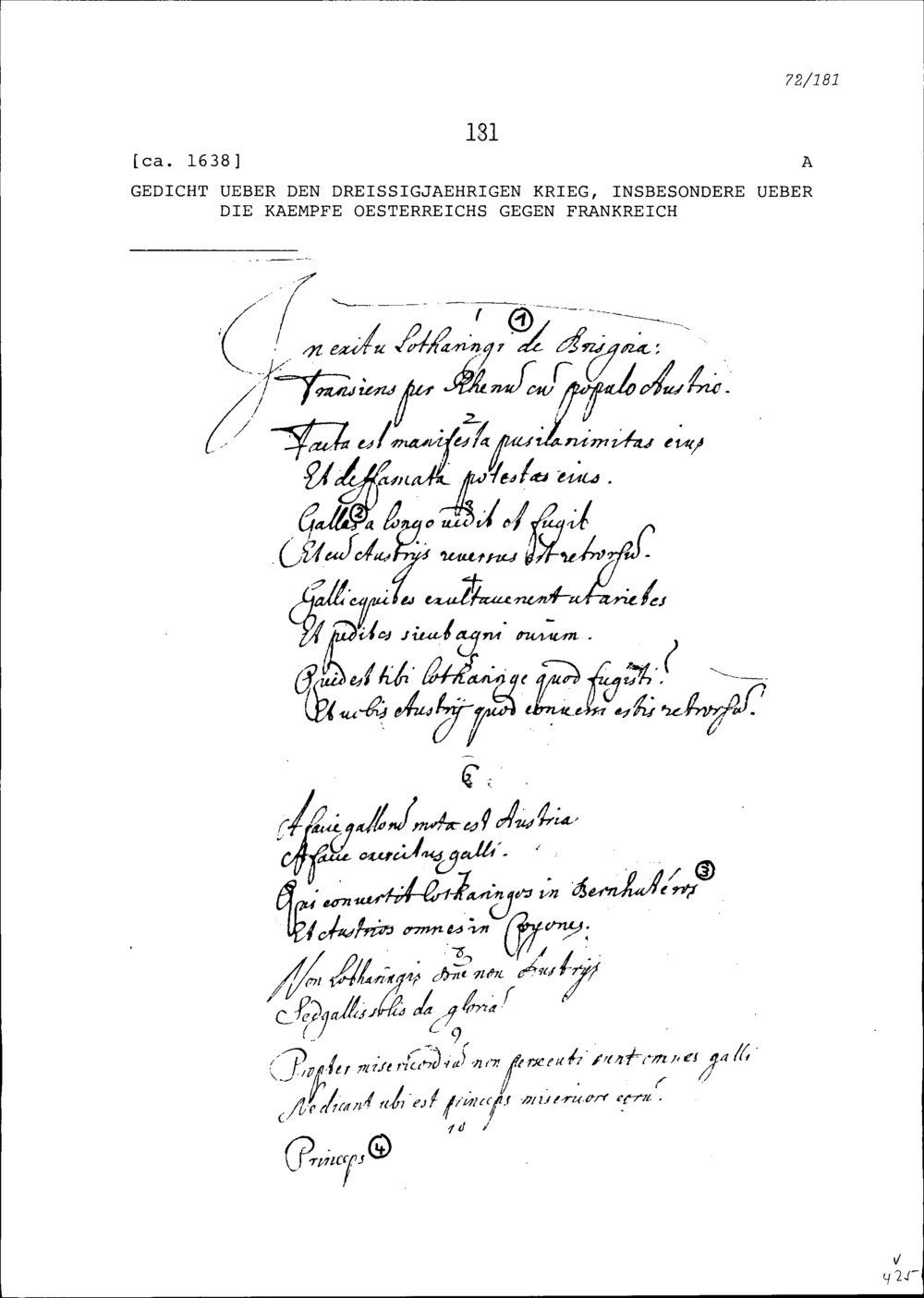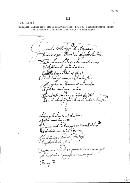 Gedicht in lateinischer Sprache über den Dreissigjährigen Krieg, insbesondere über die Kämpfe Österreichs gegen Frankreich
