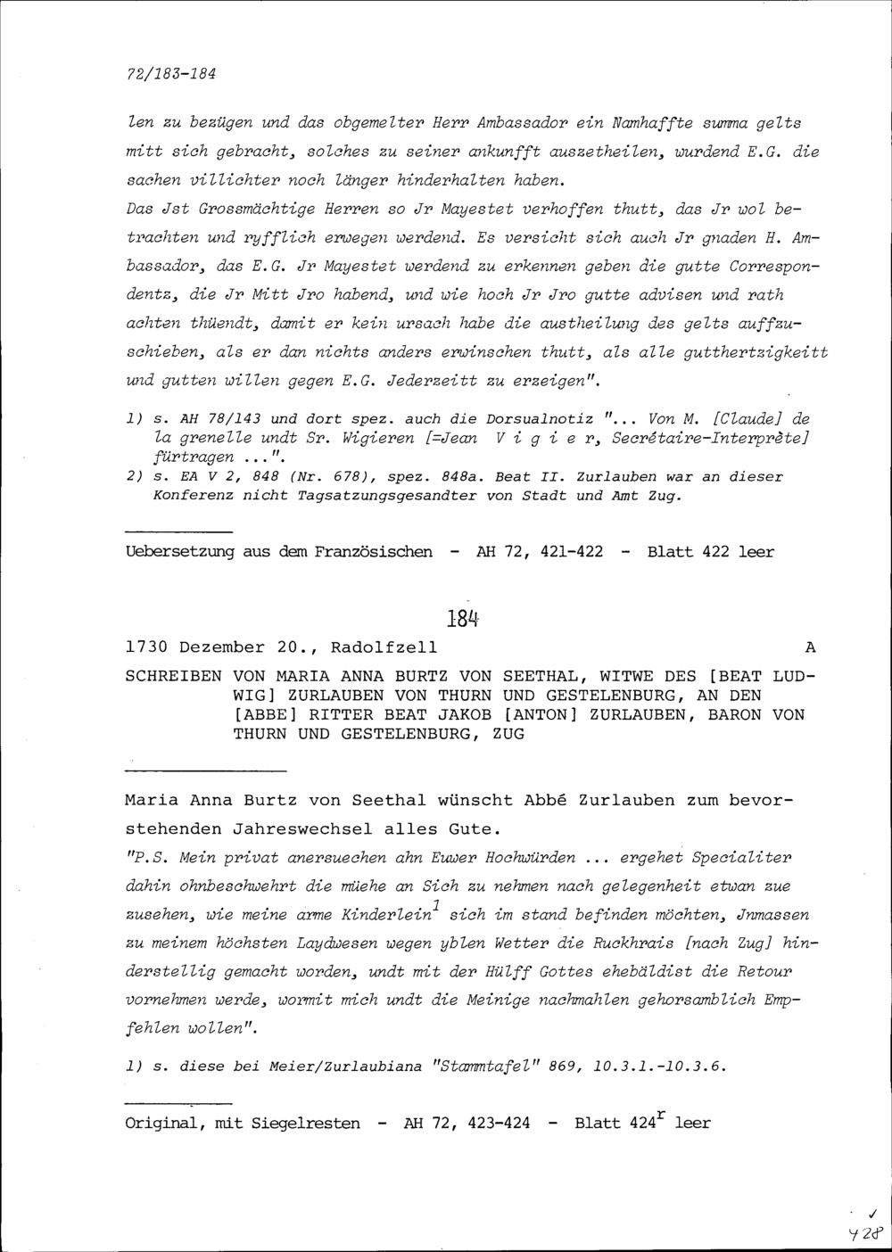 Schreiben von Maria Anna Burtz von Seethal, Witwe von Beat Ludwig Zurlauben, an Beat...