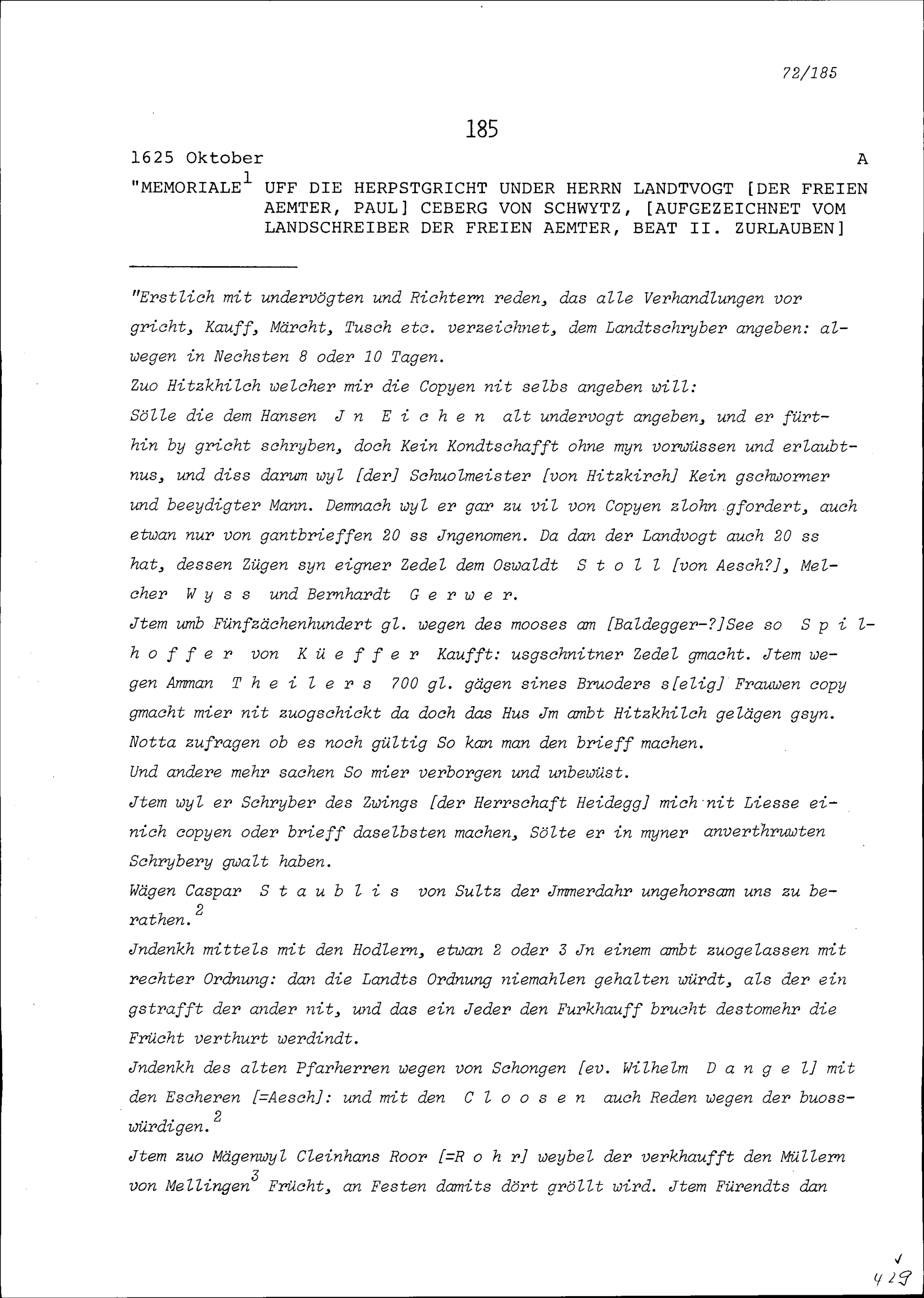 Bericht auf das Herbstgericht unter Paul Ceberg, Landvogt der Freien Ämter, von Schwyz, aufgezeichnet von Beat II. Zurlauben, Landschreiber der Freien Ämter