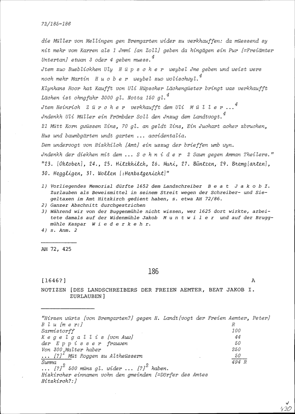 Notiz von Beat Jakob I. Zurlauben, Landschreiber der Freien Ämter,