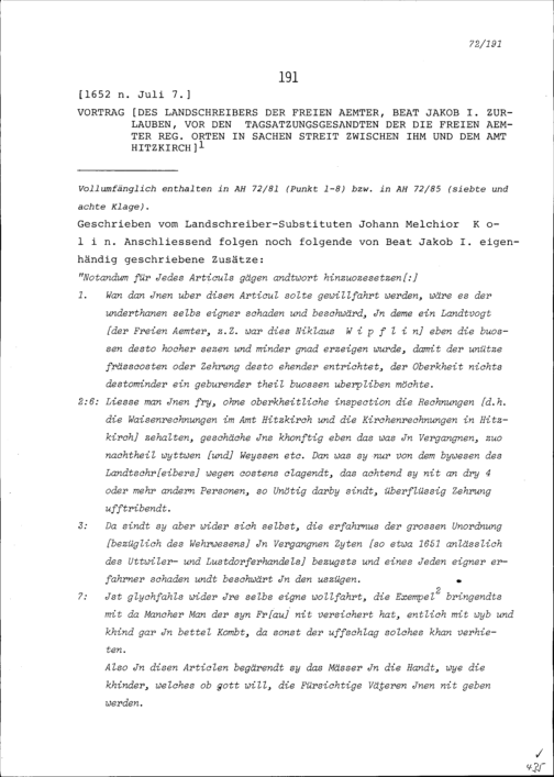 Vortrag von Beat Jakob I. Zurlauben, Landschreiber der Freien Ämter, vor den Tagsatzungsgesandten der die Freien Ämter regierenden Orten in Sachen Streit zwischen ihm und dem Amt Hitzkirch