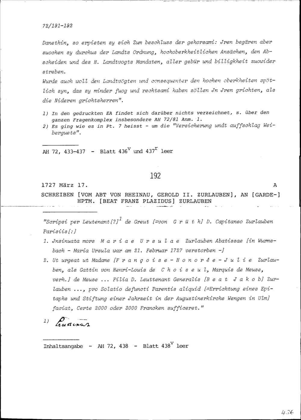 Schreiben von Gerold II. Zurlauben, Abt von Rheinau, an Beat Franz Plazidus Zurlauben, Gardehauptmann