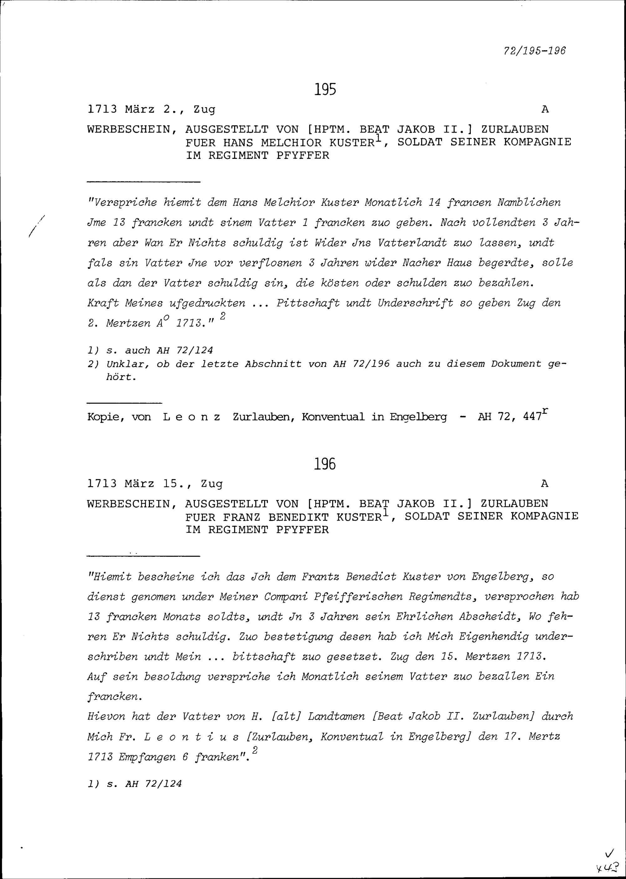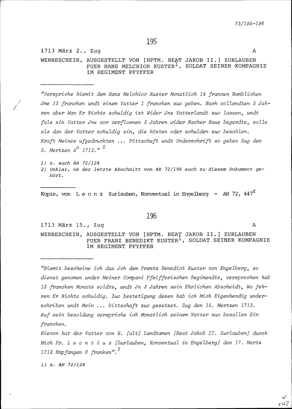 Werbeschein für Hans Melchior Kuster, Soldat seiner Kompanie im Regiment Pfyffer, ausgestellt von Beat Jakob II. Zurlauben, Hauptmann