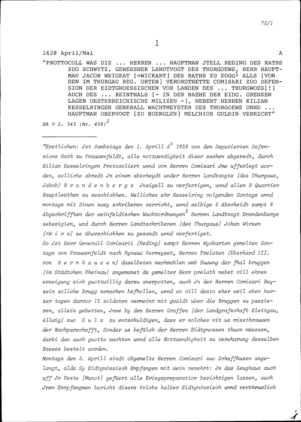 Protokoll des Defensionsrat in Frauenfeld vom 1. April 1628, beteiligt die Deputierten Ital Reding, Hauptmann, Jakob Wickart, Hauptmann, Kilian Kesselringen, Generalwachtmeister, und Melchior Guldin, Hauptmann und Obervogt zu Bürglen