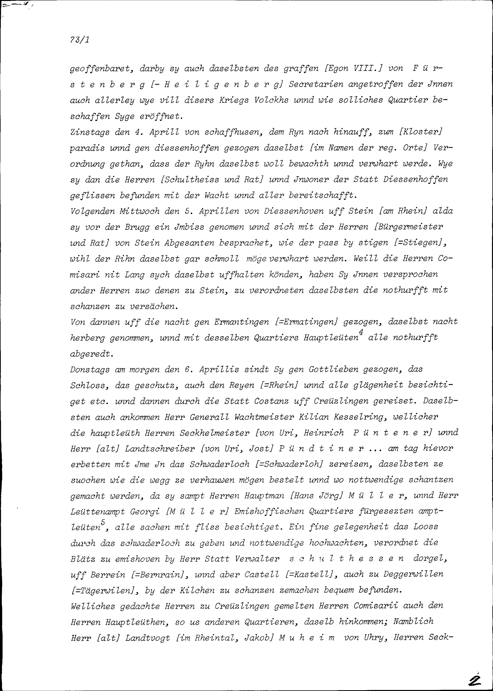 Protokoll des Defensionsrat in Frauenfeld vom 1. April 1628, beteiligt die Deputierten Ital Reding, Hauptmann, Jakob Wickart, Hauptmann, Kilian Kesselringen, Generalwachtmeister, und Melchior Guldin, Hauptmann und Obervogt zu Bürglen