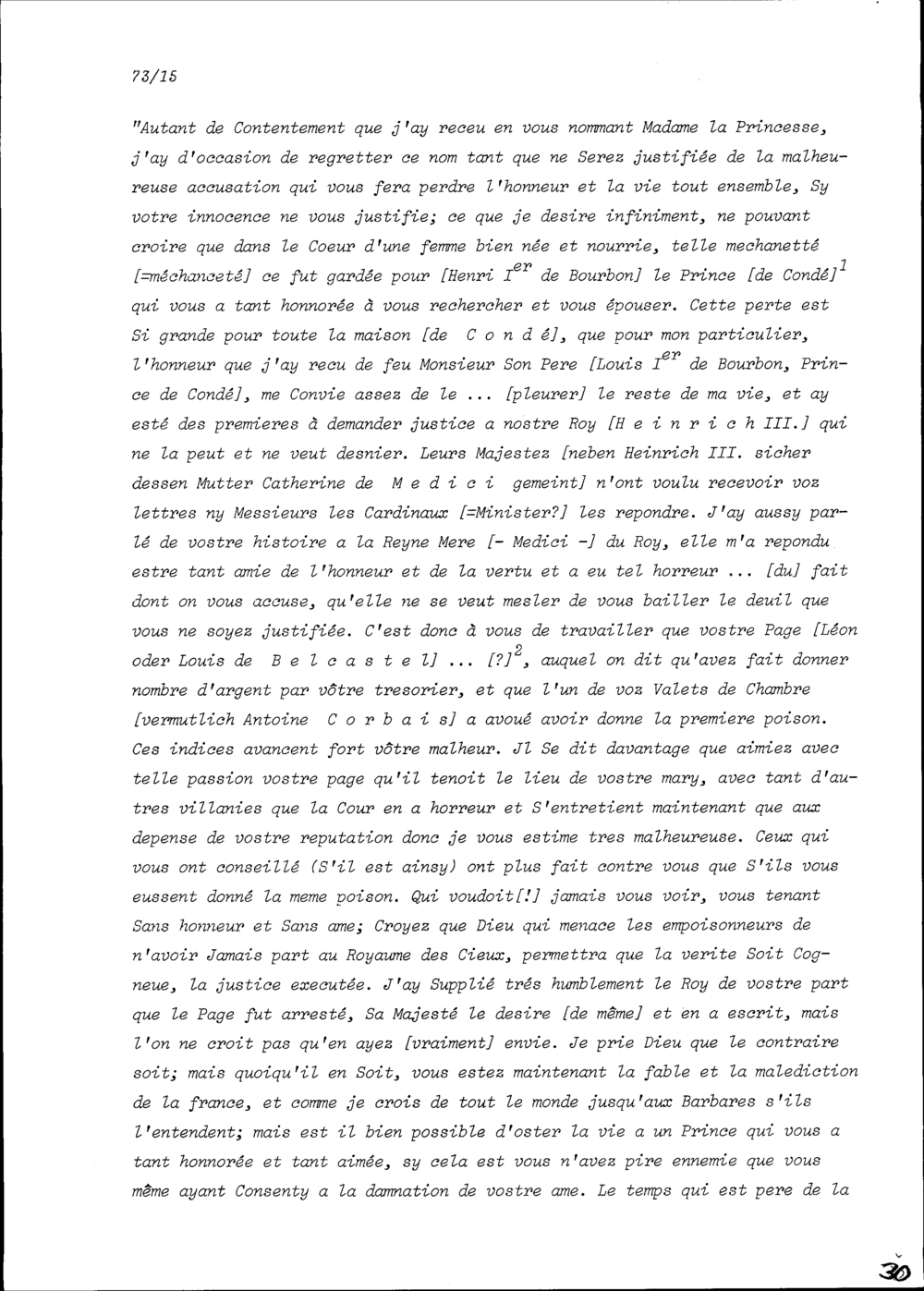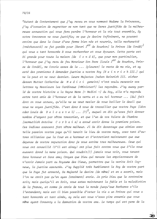 Schreiben von Françoise d'Orléans-Longueville, Witwe von Louis I. de Bourbon, an Charlotte-Cathérine de la Trémoille, Witwe von Henri I. de Bourbon
