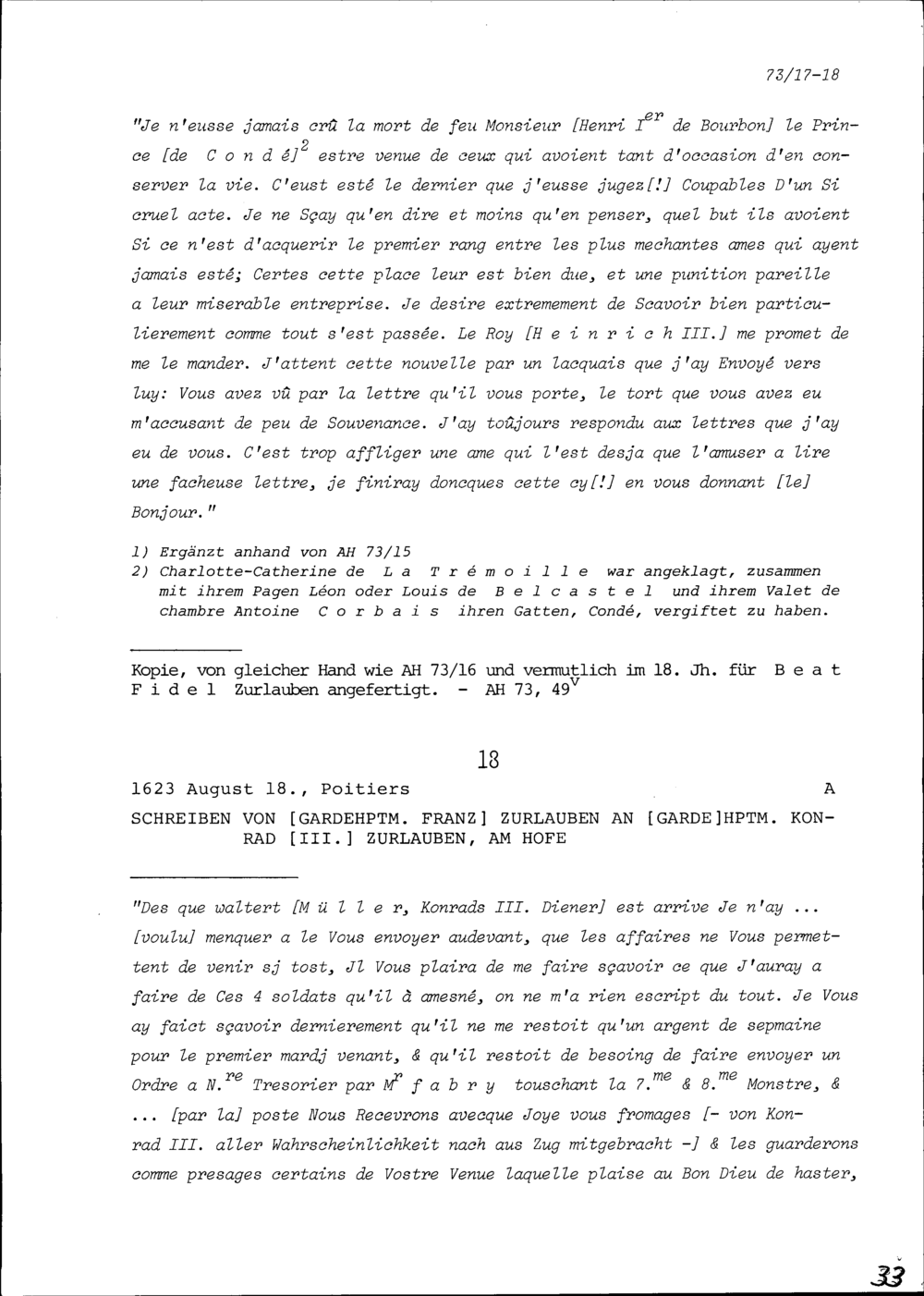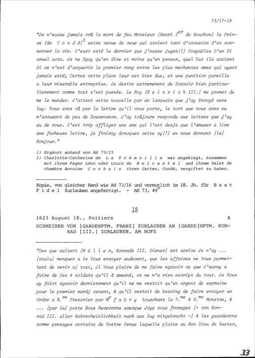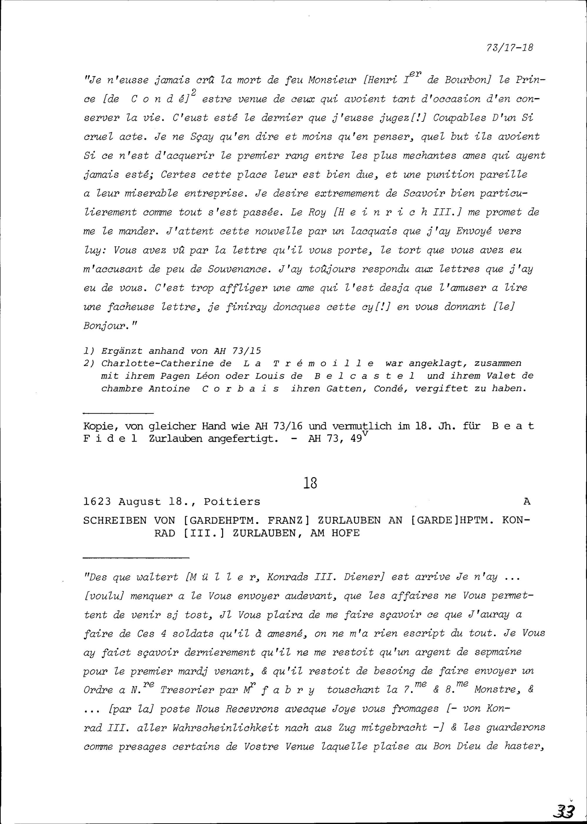 Schreiben von Franz Zurlauben, Gardehauptmann, an Konrad III. Zurlauben, Gardehauptmann,...