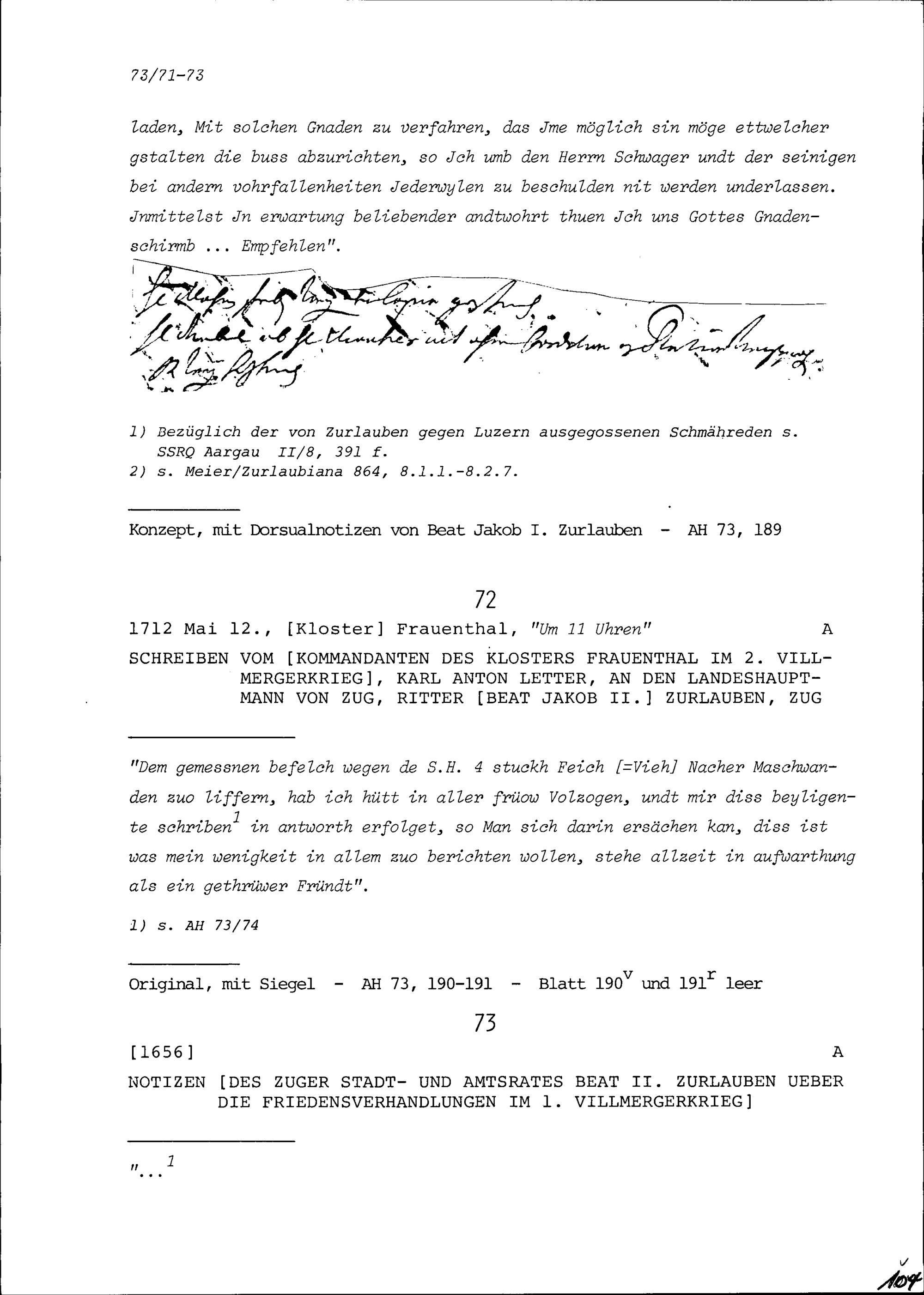 Schreiben von Karl Anton Letter, Kommandant des Frauenklosters Frauenthal im Zweiten Villmergerkrieg, an Beat Jakob II. Zurlauben, Landeshauptmann von Zug, Zug