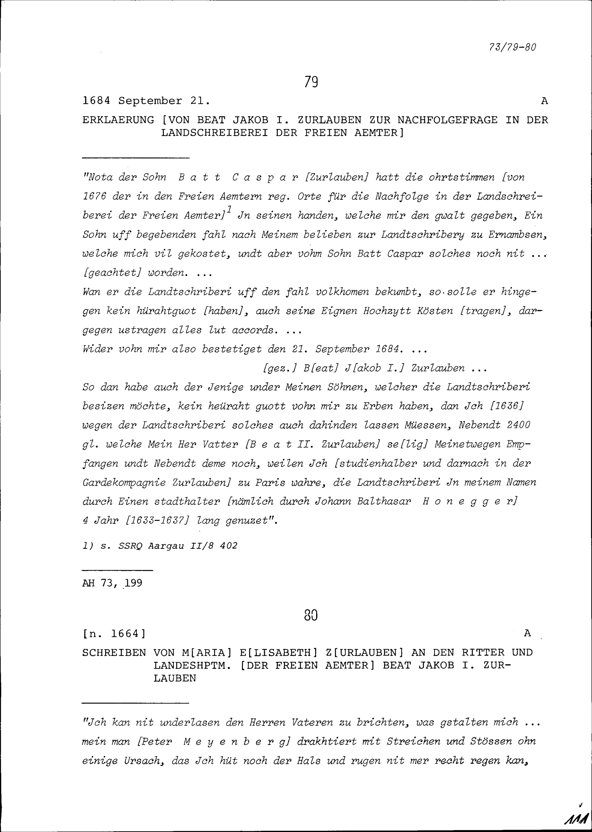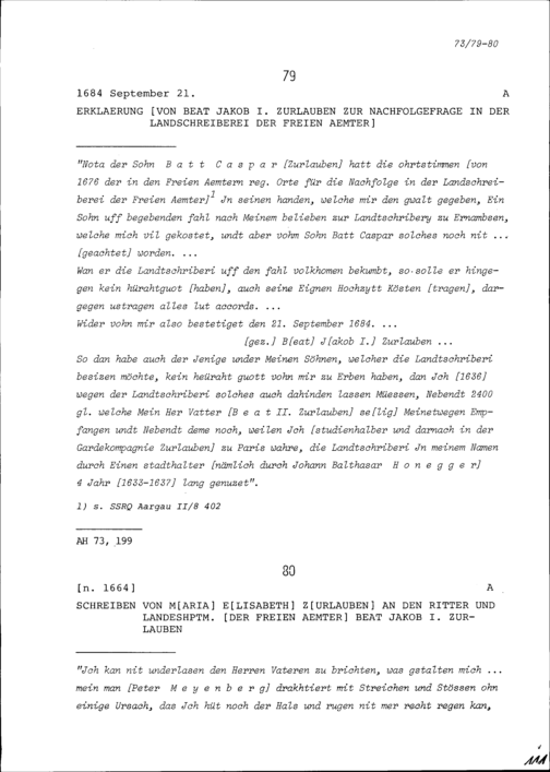Erklärung von Beat Jakob I. Zurlauben zur Nachfolgefrage in der Landschreiberei der Freien Ämter