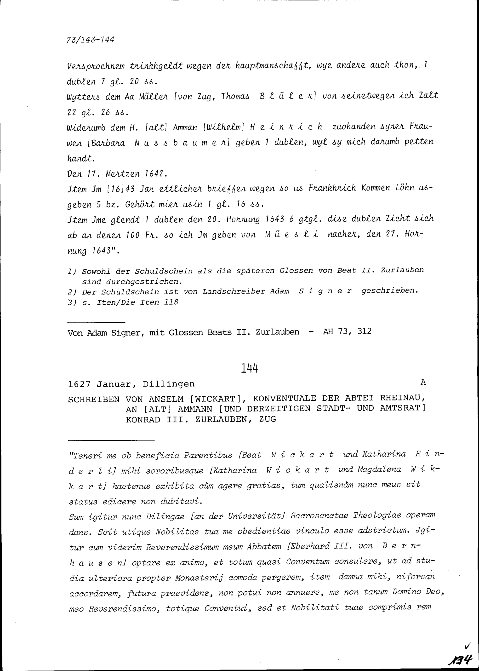 Schreiben von Anselm Wickart, Benediktinerpater der Abtei Rheinau, an Konrad III. Zurlauben, Altammann und Stadt- und Amtrat, Zug