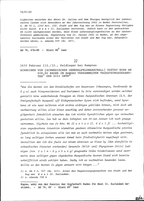 Schreiben von Gustav Horn, schwedischer Generalfeldmarschall, an die Tagsatzungsgesandten der Dreizehn Orte in Baden