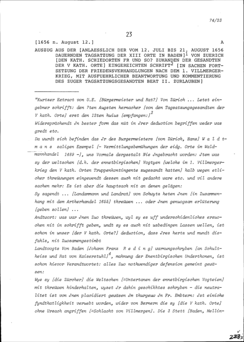 Schriften in Sachen Fortsetzung der Friedensverhandlungen nach dem Ersten Villmergerkrieg, mit ausführlicher Antwort von Beat II. Zurlauben, Zuger Tagsatzungsgesandter