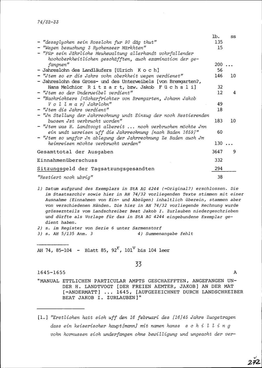 Notiz zu Amtsgeschäften, angefangen von Jakob Andermatt, Landvogt der Freien Ämter, aufgezeichnet durch Beat Jakob I. Zurlauben, Landschreiber
