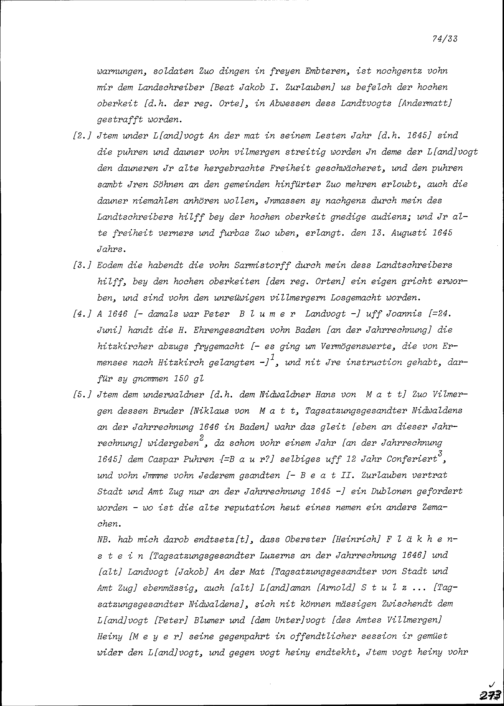 Notiz zu Amtsgeschäften, angefangen von Jakob Andermatt, Landvogt der Freien Ämter, aufgezeichnet durch Beat Jakob I. Zurlauben, Landschreiber