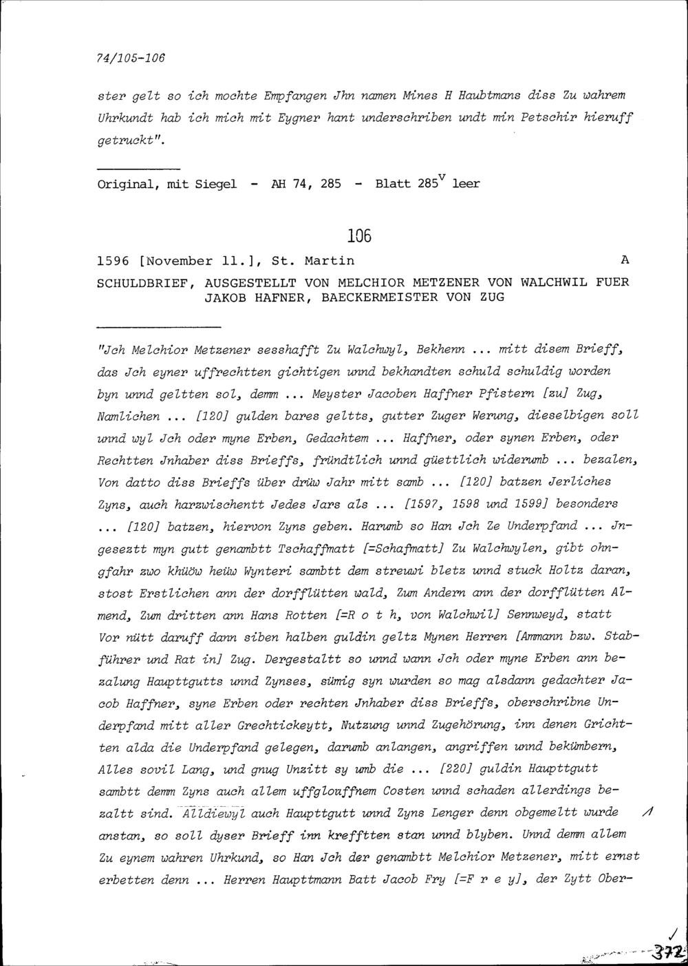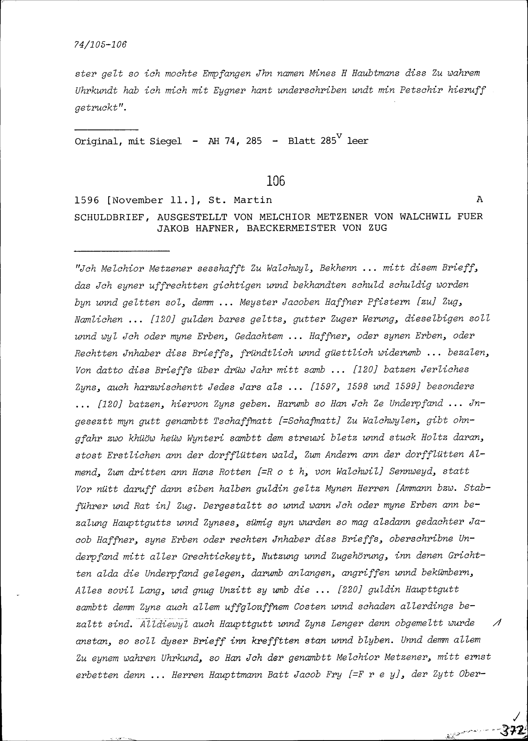 Schuldbrief, ausgestellt von Melchior Metzener von Walchwil, für Jakob Hafner, Bäckermeister von Zug