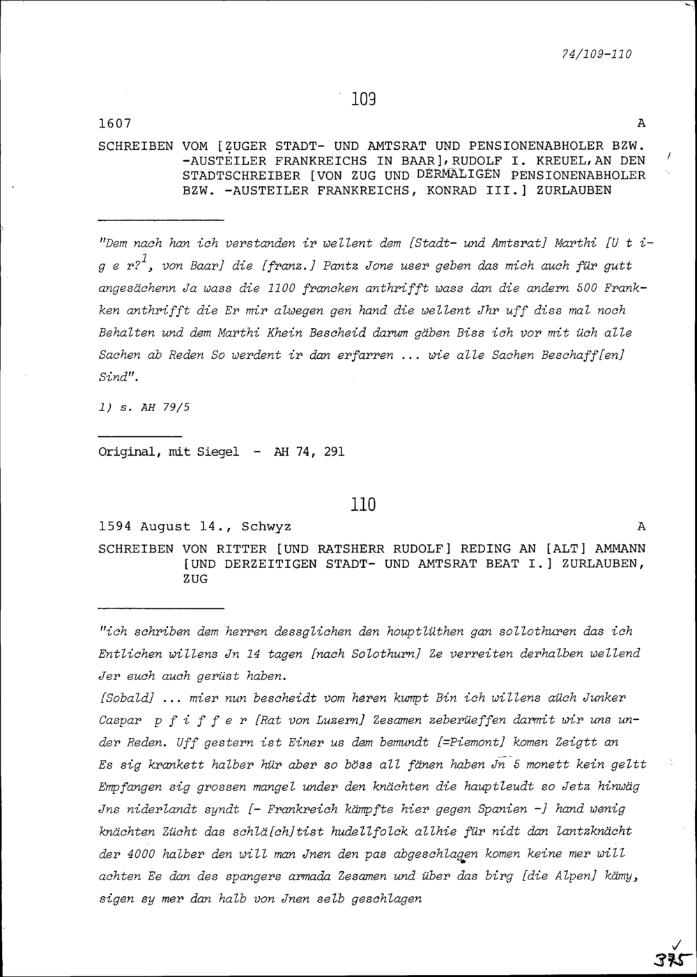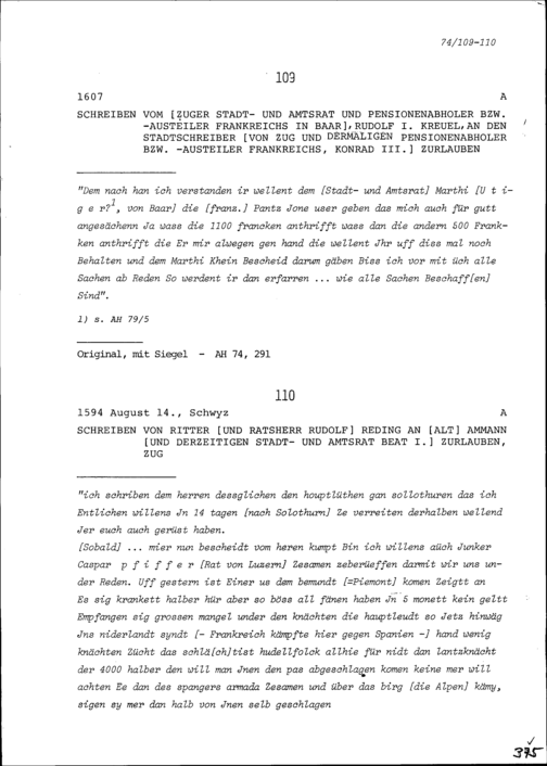 Schreiben von Rudolf I. Kreuel, Pensionenabholer und Pensionenausteiler Frankreichs in Baar, an Konrad III. Zurlauben, Pensionenabholer und Pensionenausteiler Frankreichs in Zug