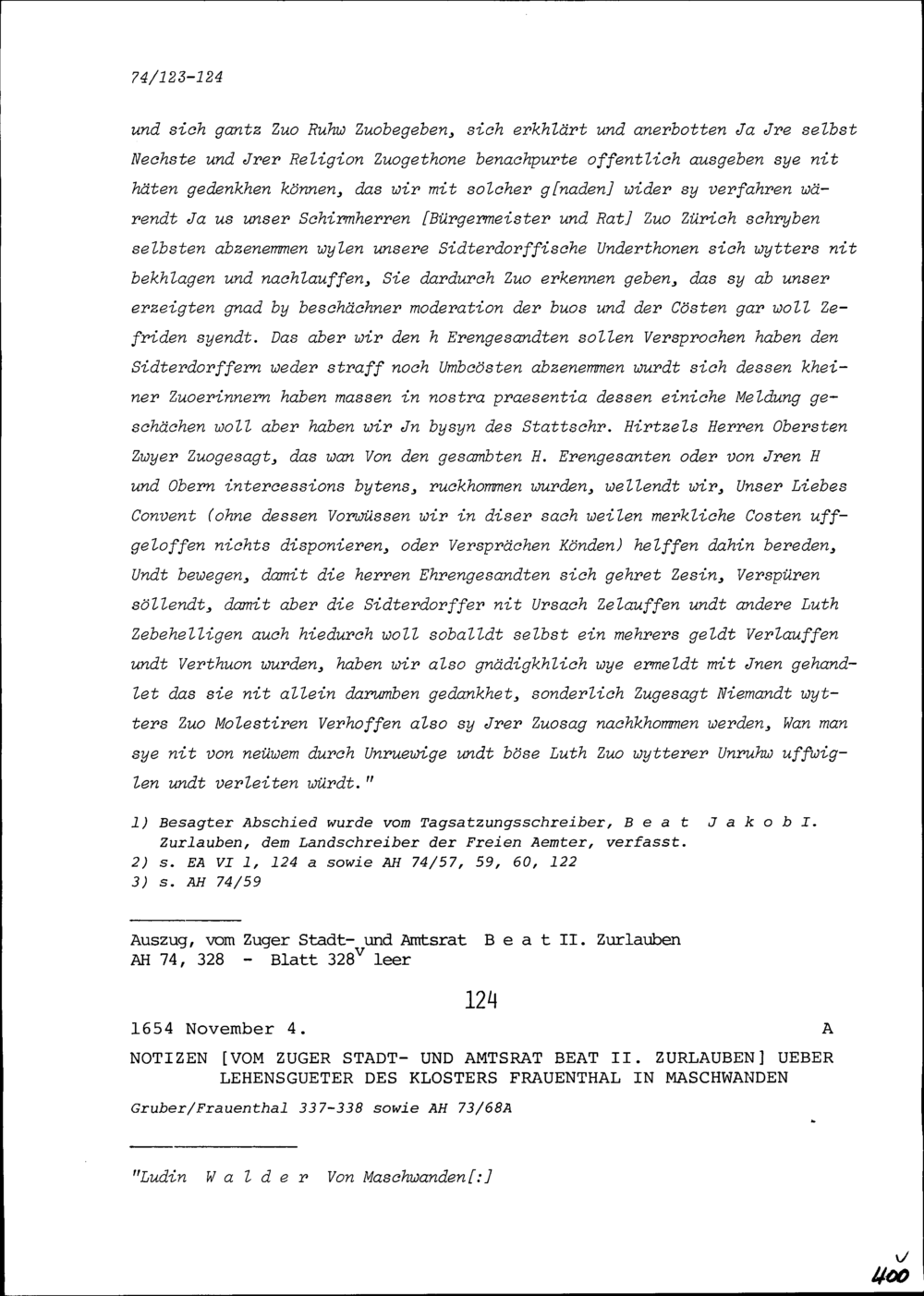 Notiz von Beat II. Zurlauben, Stadt- und Amtrat Zug, über Lehensgüter des Frauenklosters Frauenthal in Maschwanden