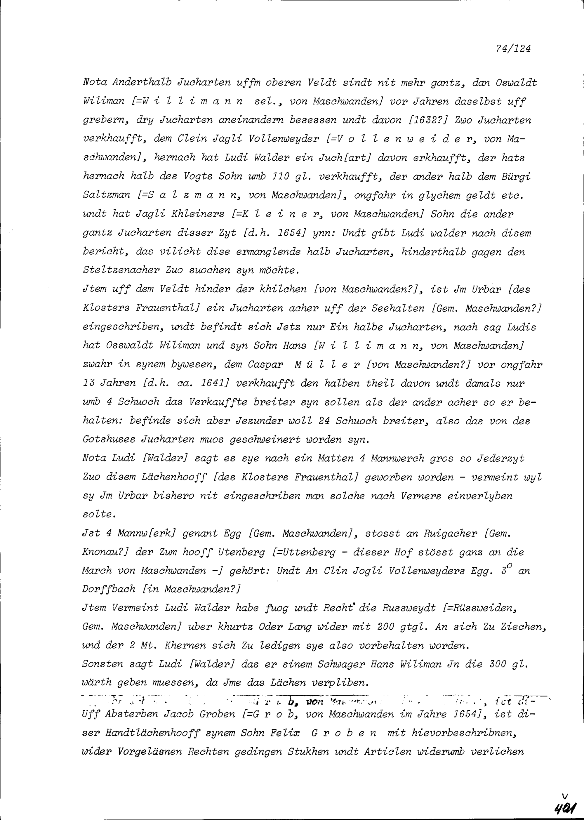Notiz von Beat II. Zurlauben, Stadt- und Amtrat Zug, über Lehensgüter des Frauenklosters Frauenthal in Maschwanden