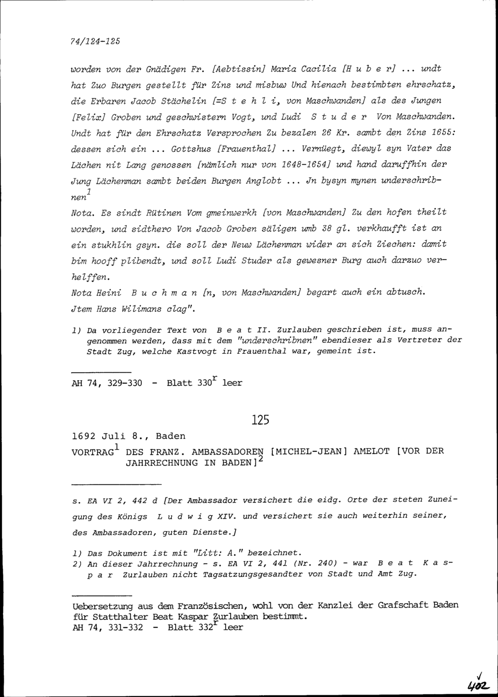 Vortrag von Michel-Jean Amelot, Ambassador von Frankreich, vor der Jahrrechnung in Baden