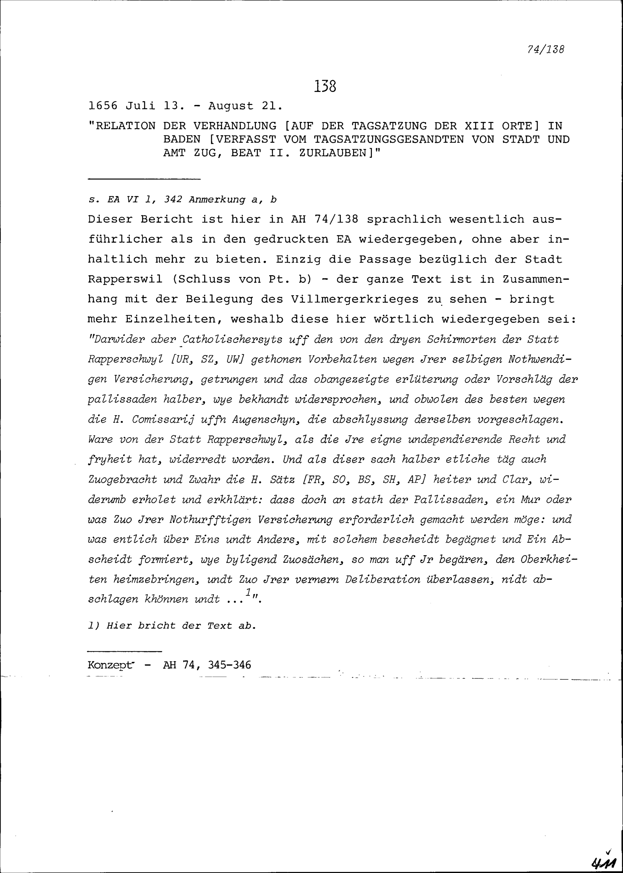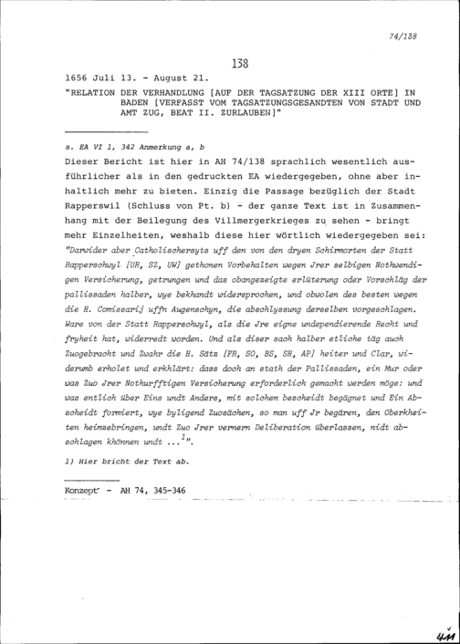 Bericht über die Verhandlung auf der Tagsatzung der Dreizehn Orte in Baden, verfasst...