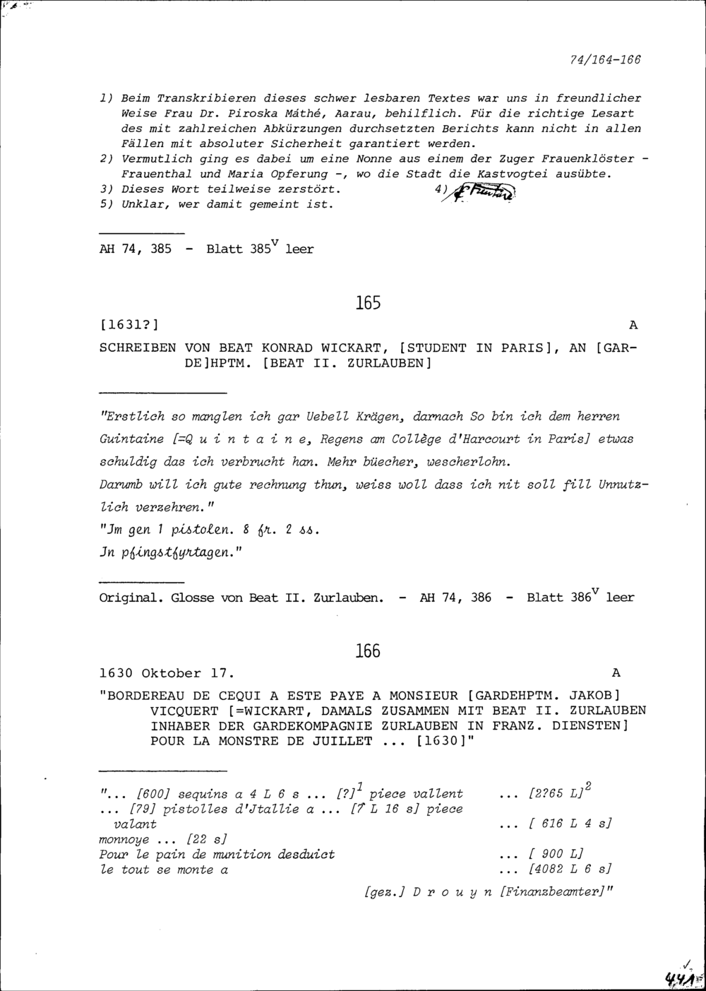 Schreiben von Beat Konrad Wickart, Student in Paris, an Beat II. Zurlauben, Gard...