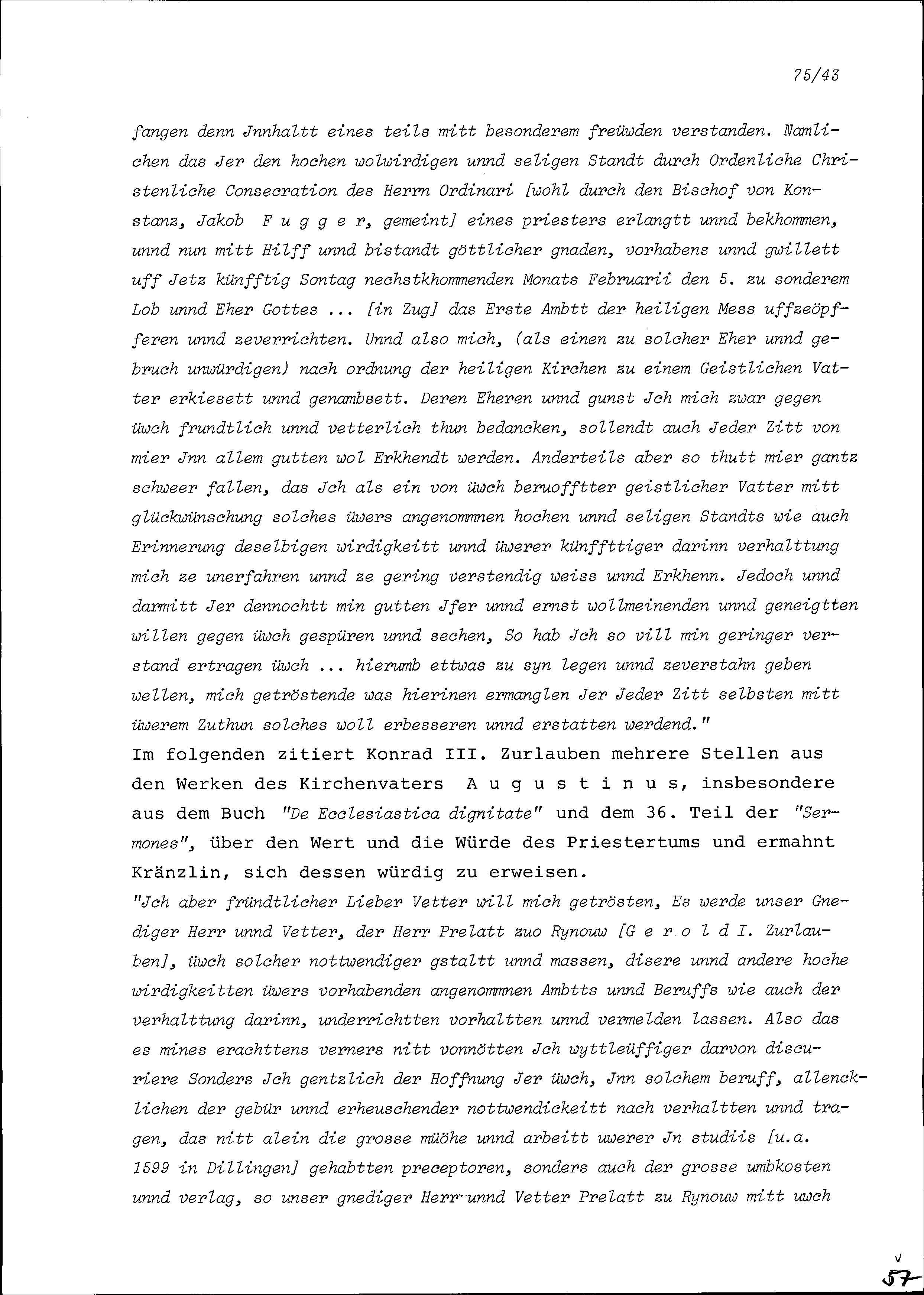 Schreiben von Konrad III. Zurlauben an Michael Johann Kränzlin, seinen Geistlichen Sohn und Pfarrer in Klingnau