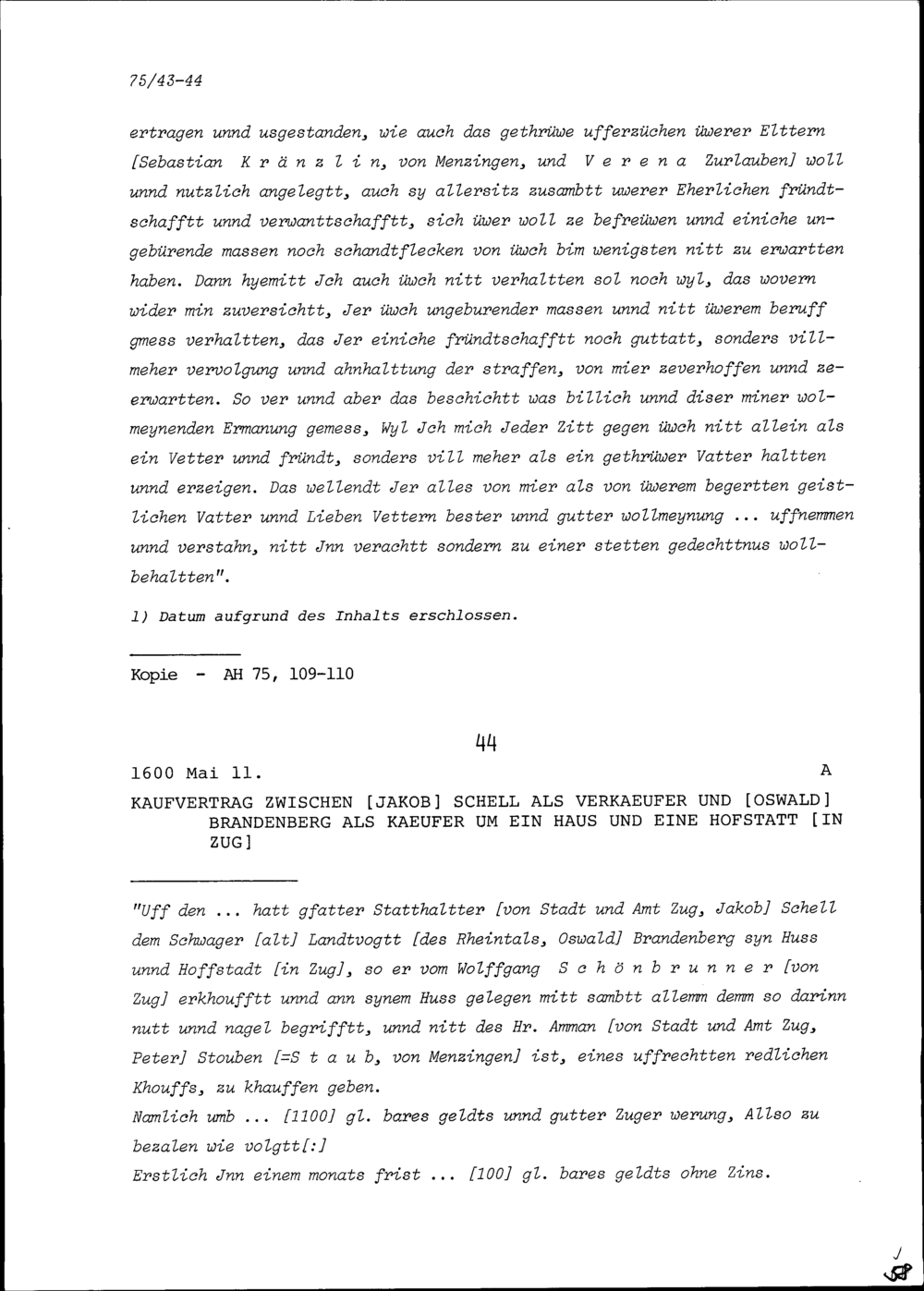 Kaufvertrag zwischen Jakob Schell als Verkäufer und Oswald Brandenberg als Käufer um ein Haus und eine Hofstatt in Zug, das er von Wolfgang Schönbrunner gekauft hatte