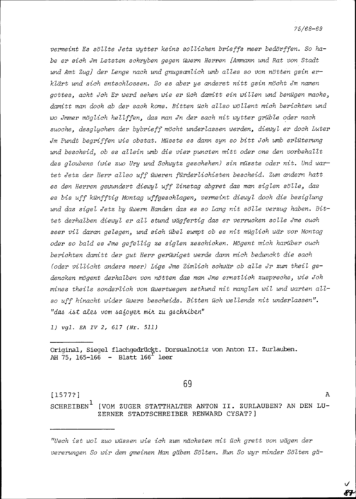 Schreiben von Anton II. Zurlauben, Statthalter Zug, an Renward Cysat, Luzerner S...