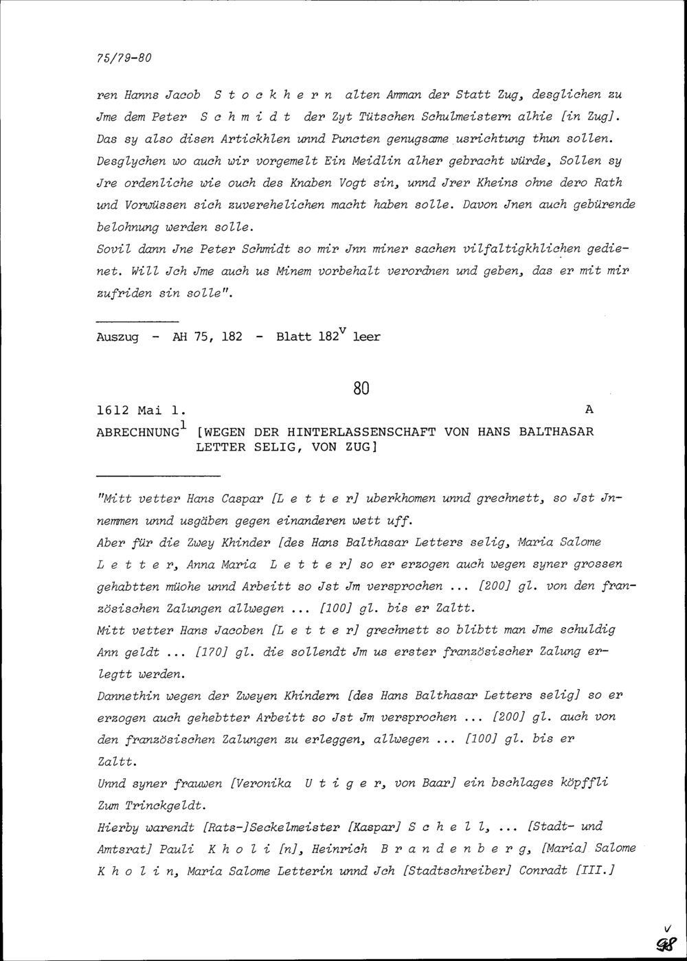 Abrechnung wegen der Hinterlassenschaft von Hans Balthasar Letter, Zug