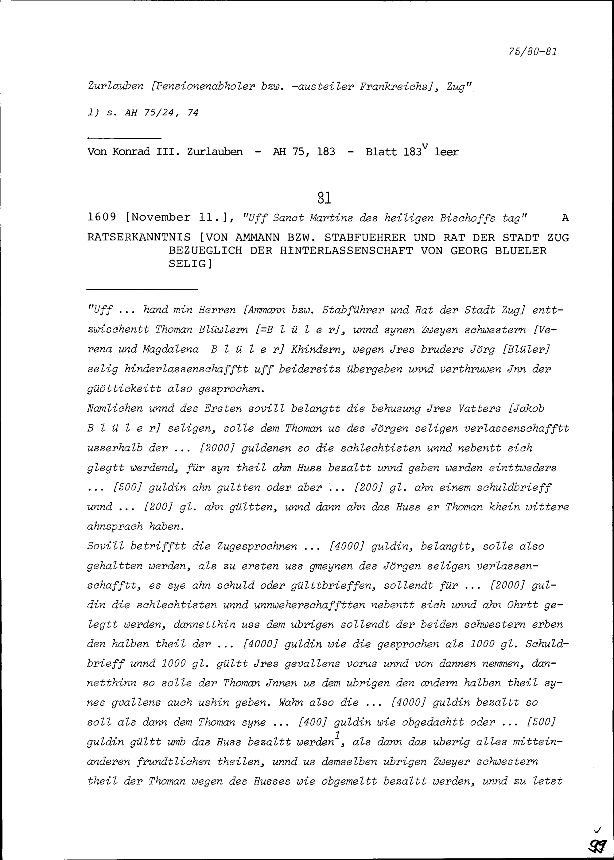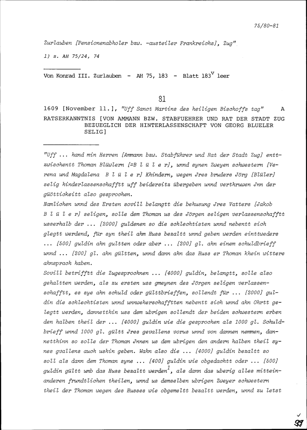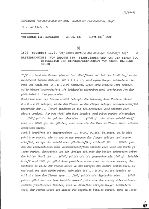 Ratsbeschluss des Ammanns und Rats der Stadt Zug bezüglich der Hinterlassenschaft von Georg Blüler