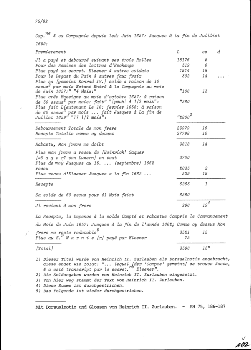 Abrechnung von Heinrich II. Zurlauben, Gardehauptmann, mit Konrad IV. Zurlauben, seinem Bruder und Gardeleutnant