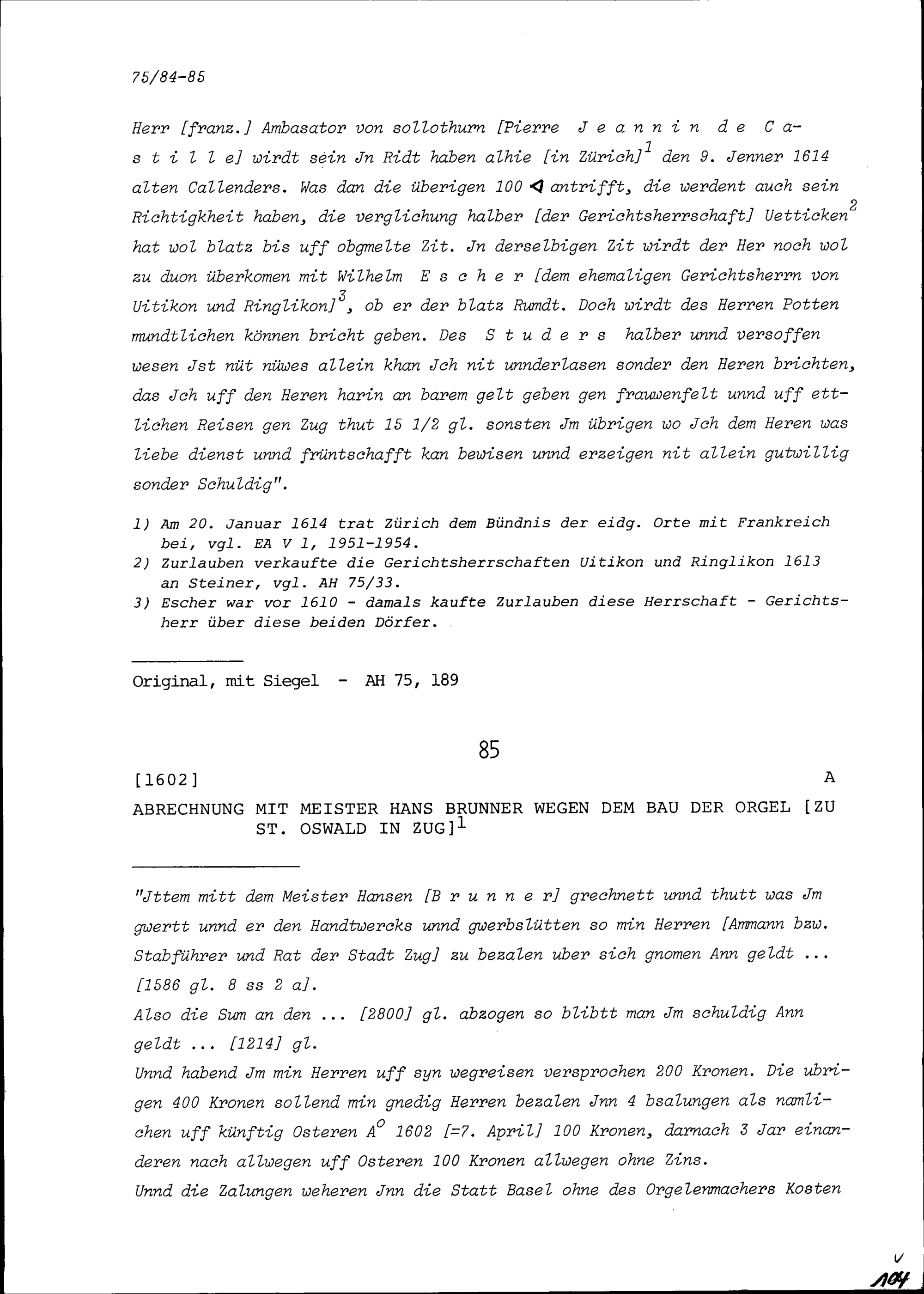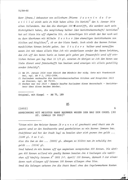 Abrechnung mit Hans Brunner, Meister, wegen dem Bau der Orgel zu Sankt Oswald in Zug