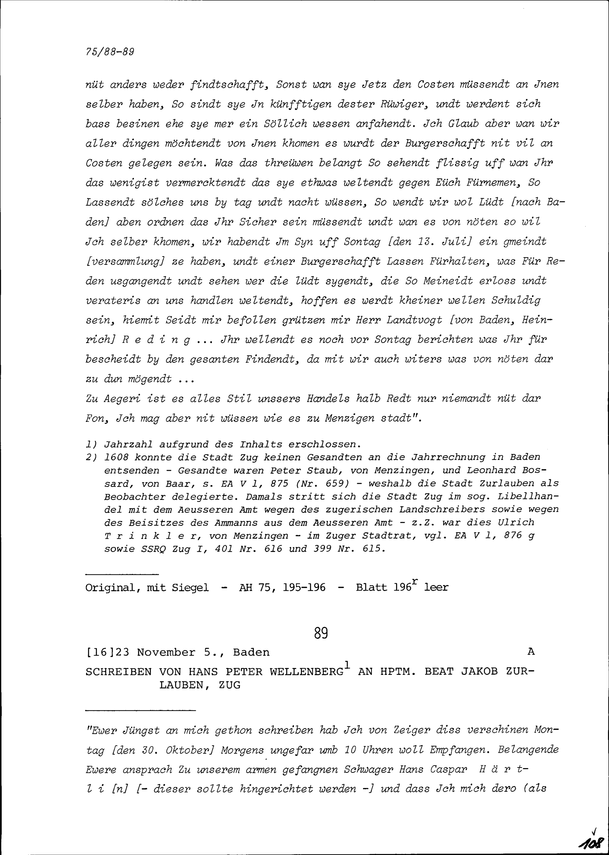 Schreiben von Hans Peter Wellenberg an Beat Jakob Zurlauben, Hauptmann, Zug