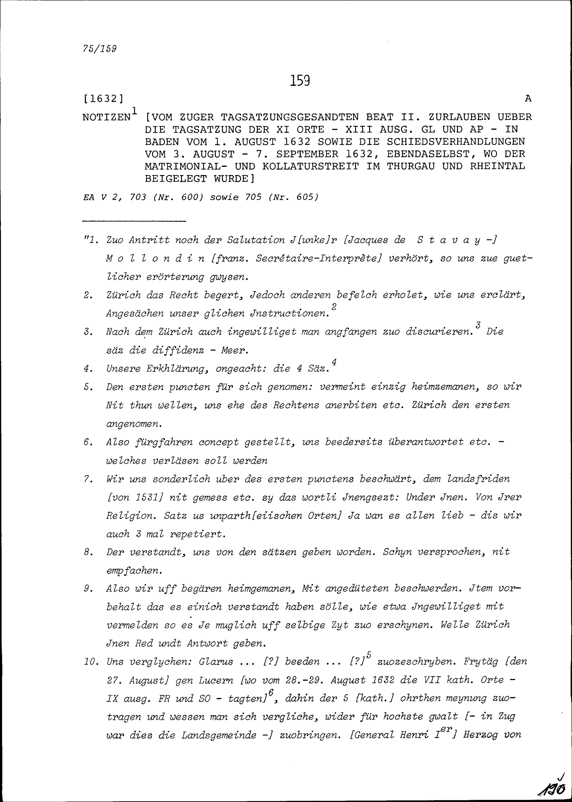 Notiz von Beat II. Zurlauben, Zuger Tagsatzungsgesandter, über die Tagsatzung der Elf Orte in Baden vom 1. August 1632 sowie die Schiedsverhandlungen vom 3. August bis 7. September 1632 betreffend Matrimonial- und Kollaturstreit im Thurgau und Rheintal