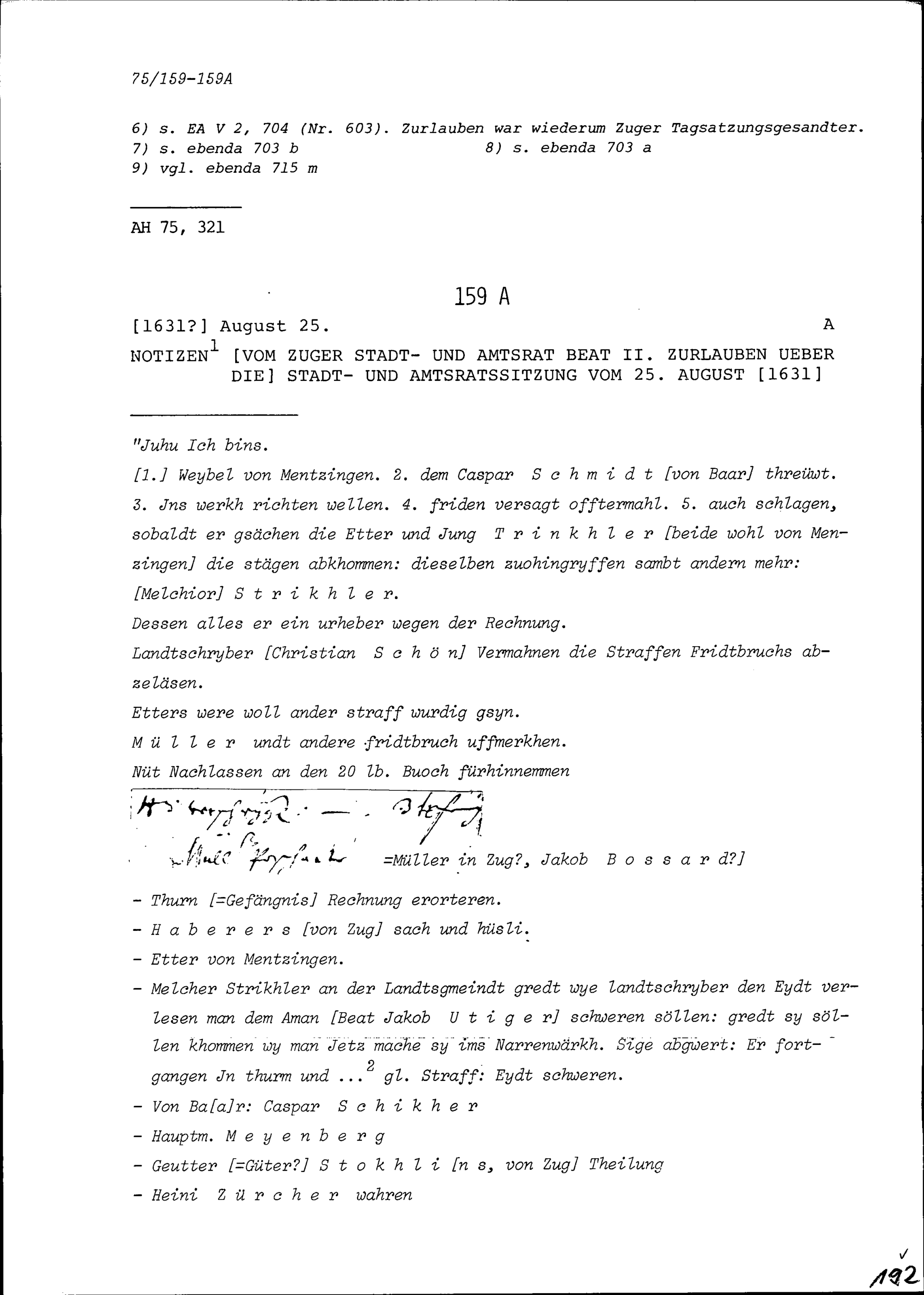 Notiz von Beat II. Zurlauben, Stadt- und Amtrat Zug, über die Stadt- und Amtratssitzung vom 25. August 1631