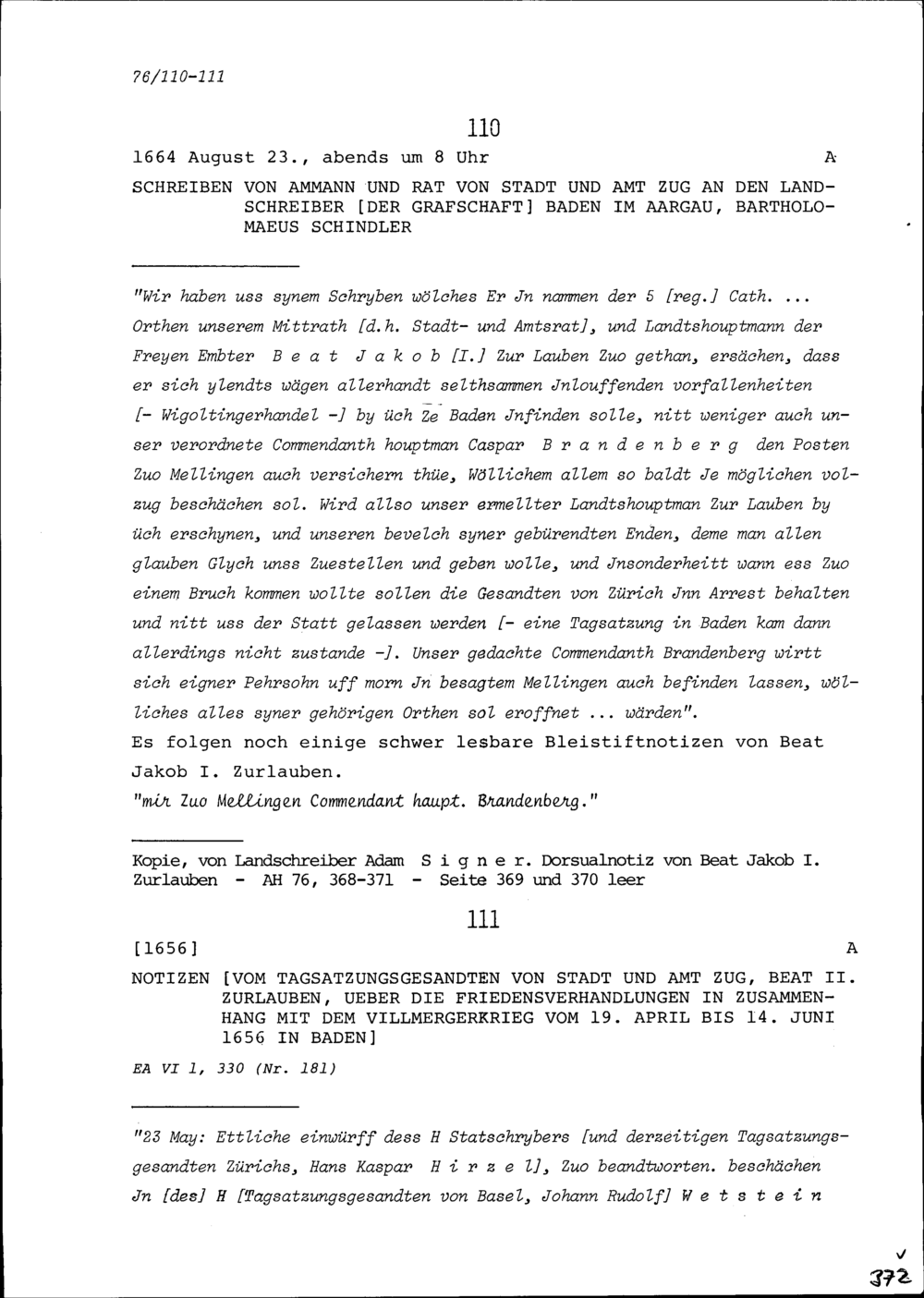 Schreiben des Ammanns und Rats von Stadt und Amt Zug an Bartholomäus Schindler, Landschreiber der Grafschaft Baden im Aargau