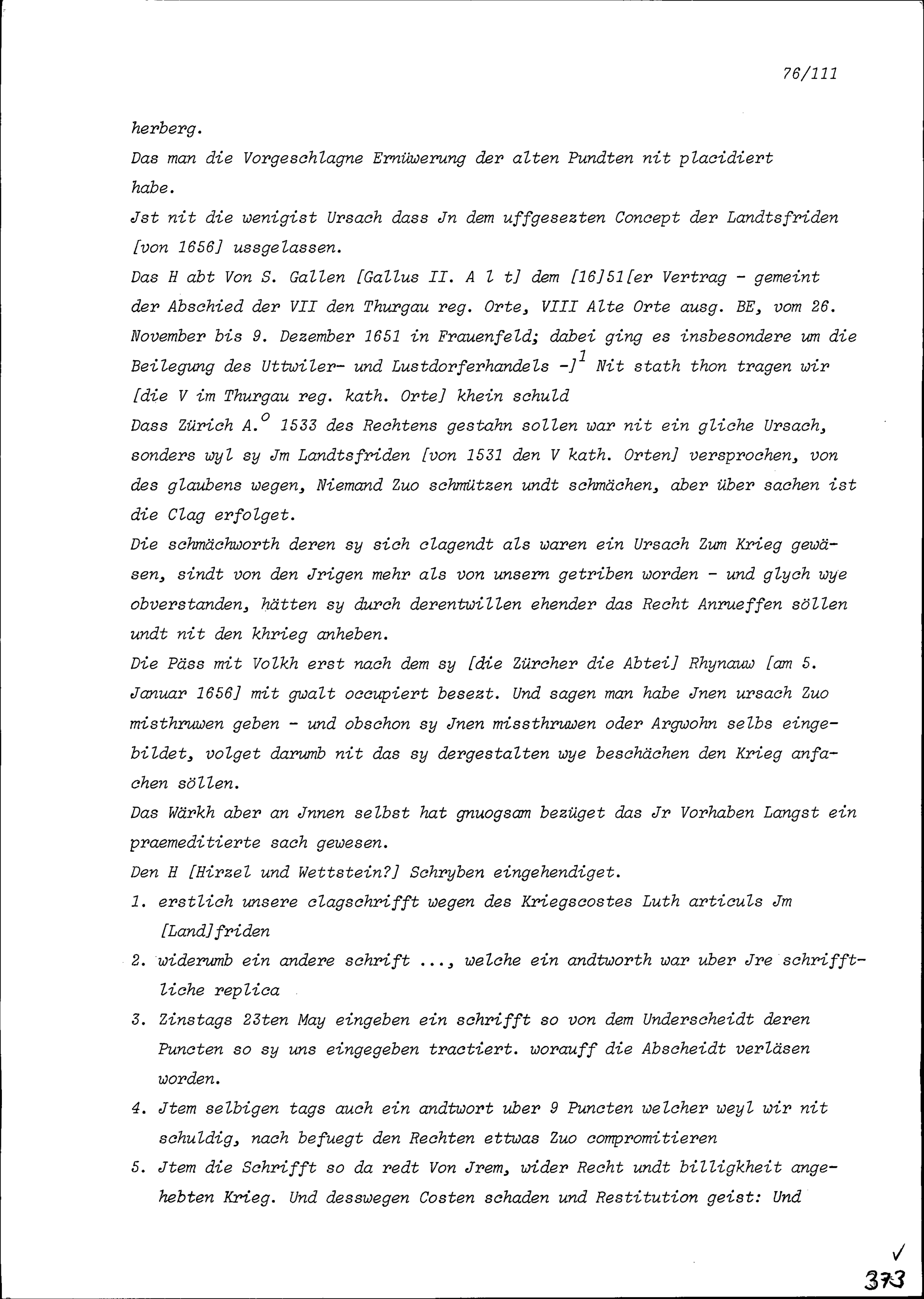 Notiz von Beat II. Zurlauben, Tagsatzungsgesandter von Stadt und Amt Zug, über die Friedensverhandlungen vom 19. April bis 14. Juni 1656 in Baden