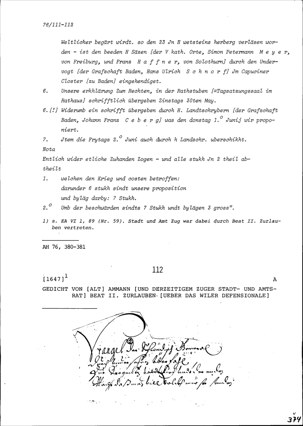 Gedicht von Beat II. Zurlauben, Altammann und Stadt- und Amtrat Zug, über das Wiler Defensionale