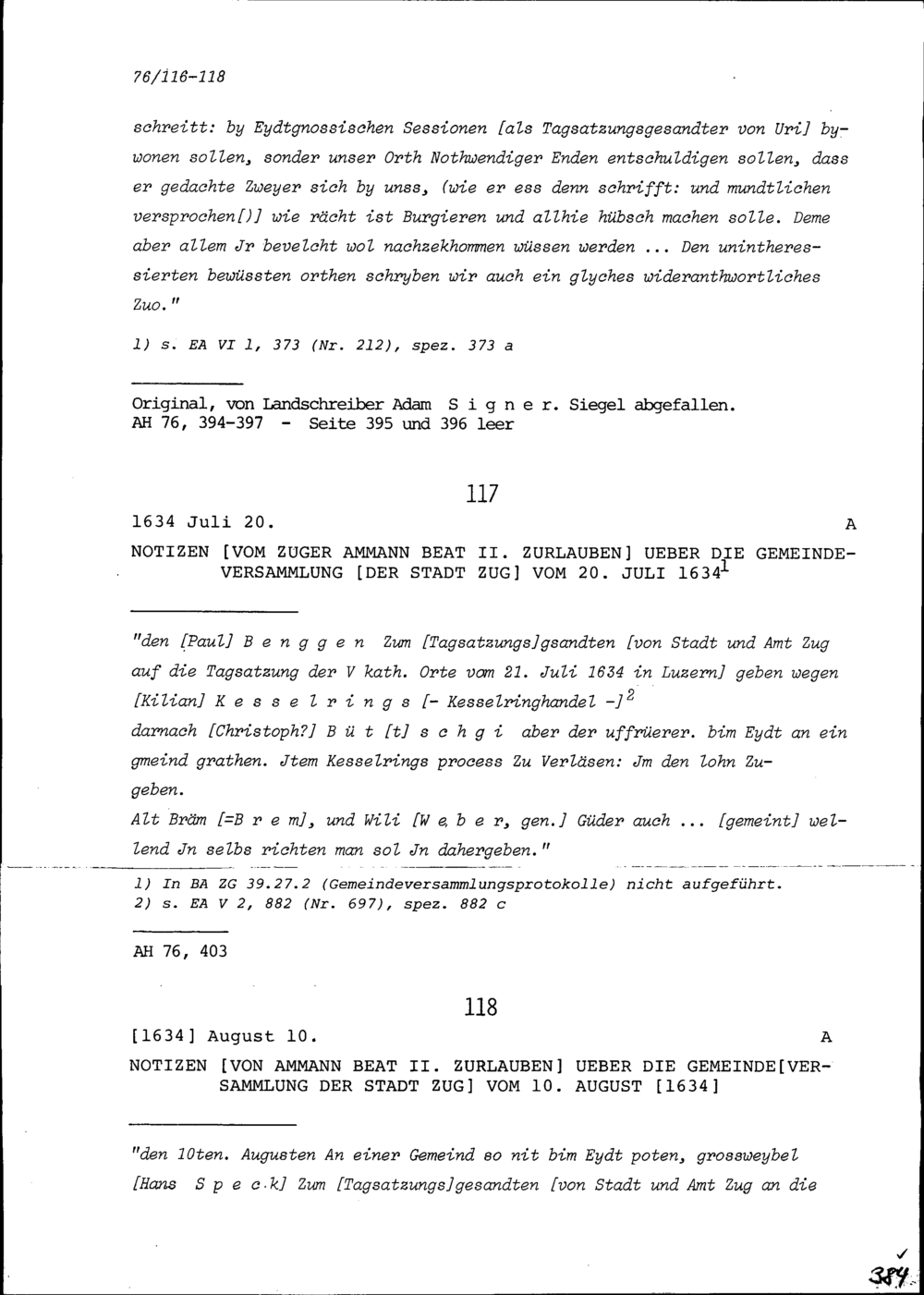 Notiz von Beat II. Zurlauben, Ammann Zug, über die Gemeindeversammlung der Stadt Zug vom 20. Juli 1634
