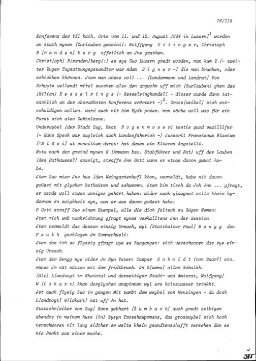 Notiz von Beat II. Zurlauben, Ammann, über die Gemeindeversammlung der Stadt Zug vom 10. August 1634