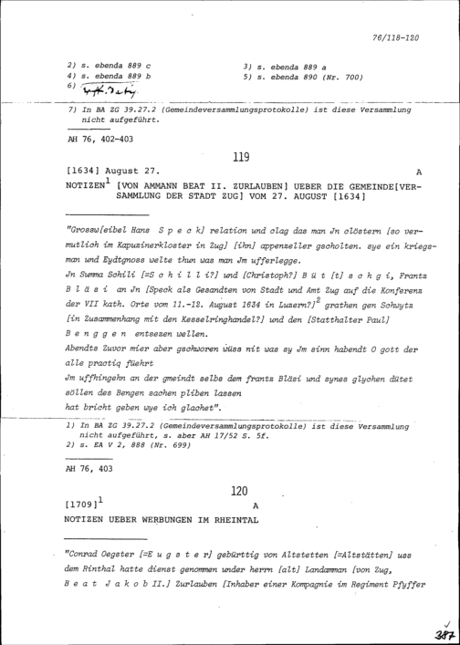 Notiz von Beat II. Zurlauben, Ammann, über die Gemeindeversammlung der Stadt Zug vom 27. August 1634
